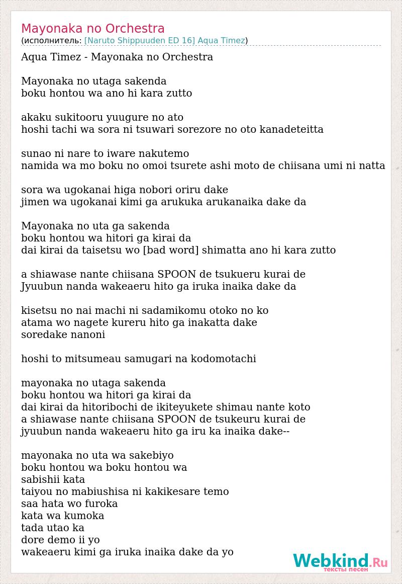 Aqua Timez - Mayonaka no Orchestra Mayonaka no utaga sakenda boku hontou wa ano hi kara zutto akaku sukitooru yuugure no ato hoshi tachi wa sora ni tsuwari sorezore no oto kanadeteitta sunao ni nare to iware nakutemo namida wa mo boku no omoi tsurete ashi moto de chiisana umi ni natta sora wa ugokanai higa nobori oriru dake jimen wa ugokanai kimi ga arukuka arukanaika dake da Mayonaka no uta ga sakenda boku hontou wa hitori ga kirai da dai kirai da taisetsu wo [bad word] shimatta ano hi kara zutto a shiawase nante chiisana SPOON de tsukueru kurai de Jyuubun nanda wakeaeru hito ga iruka inaika dake da kisetsu no nai machi ni sadamikomu otoko no ko atama wo nagete kureru hito ga inakatta dake soredake nanoni hoshi to mitsumeau samugari na kodomotachi mayonaka no utaga sakenda boku hontou wa hitori ga kirai da dai kirai da hitoribochi de ikiteyukete shimau nante koto a shiawase nante chiisana SPOON de tsukeuru kurai de jyuubun nanda wakeaeru hito ga iru ka inaika dake-- mayonaka no uta wa sakebiyo boku hontou wa boku hontou wa sabishii kata taiyou no mabiushisa ni kakikesare temo saa hata wo furoka kata wa kumoka tada utao ka dore demo ii yo wakeaeru kimi ga iruka inaika dake da yo