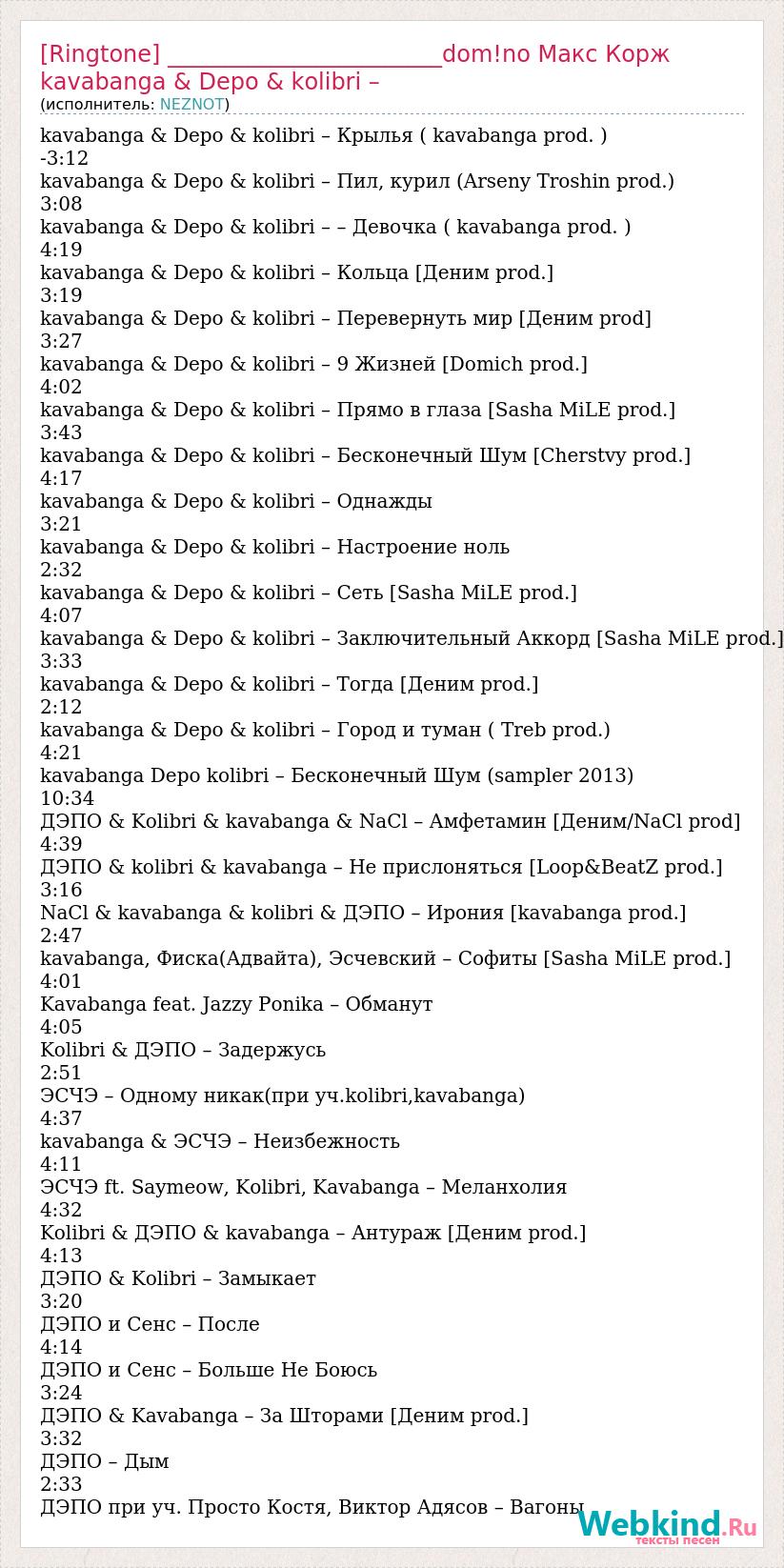 kavabanga & Depo & kolibri – Крылья ( kavabanga prod. ) -3:12 kavabanga & Depo & kolibri – Пил, курил (Arseny Troshin prod.) 3:08 kavabanga & Depo & kolibri – – Девочка ( kavabanga prod. ) 4:19 kavabanga & Depo & kolibri – Кольца [Деним prod.] 3:19 kavabanga & Depo & kolibri – Перевернуть мир [Деним prod] 3:27 kavabanga & Depo & kolibri – 9 Жизней [Domich prod.] 4:02 kavabanga & Depo & kolibri – Прямо в глаза [Sasha MiLE prod.] 3:43 kavabanga & Depo & kolibri – Бесконечный Шум [Cherstvy prod.] 4:17 kavabanga & Depo & kolibri – Однажды 3:21 kavabanga & Depo & kolibri – Настроение ноль 2:32 kavabanga & Depo & kolibri – Сеть [Sasha MiLE prod.] 4:07 kavabanga & Depo & kolibri – Заключительный Аккорд [Sasha MiLE prod.] 3:33 kavabanga & Depo & kolibri – Тогда [Деним prod.] 2:12 kavabanga & Depo & kolibri – Город и туман ( Treb prod.) 4:21 kavabanga Depo kolibri – Бесконечный Шум (sampler 2013) 10:34 ДЭПО & Kolibri & kavabanga & NaCl – Амфетамин [Деним/NaCl prod] 4:39 ДЭПО & kolibri & kavabanga – Не прислоняться [Loop&BeatZ prod.] 3:16 NaCl & kavabanga & kolibri & ДЭПО – Ирония [kavabanga prod.] 2:47 kavabanga, Фиска(Адвайта), Эсчевский – Софиты [Sasha MiLE prod.] 4:01 Kavabanga feat. Jazzy Ponika – Обманут 4:05 Kolibri & ДЭПО – Задержусь 2:51 ЭСЧЭ – Одному никак(при уч.kolibri,kavabanga) 4:37 kavabanga & ЭСЧЭ – Неизбежность 4:11 ЭСЧЭ ft. Saymeow, Kolibri, Kavabanga – Меланхолия 4:32 Kolibri & ДЭПО & kavabanga – Антураж [Деним prod.] 4:13 ДЭПО & Kolibri – Замыкает 3:20 ДЭПО и Сенс – После 4:14 ДЭПО и Сенс – Больше Не Боюсь 3:24 ДЭПО & Kavabanga – За Шторами [Деним prod.] 3:32 ДЭПО – Дым 2:33 ДЭПО при уч. Просто Костя, Виктор Адясов – Вагоны