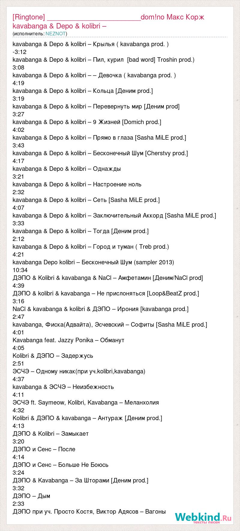 kavabanga & Depo & kolibri – Крылья ( kavabanga prod. ) -3:12 kavabanga & Depo & kolibri – Пил, курил [bad word] Troshin prod.) 3:08 kavabanga & Depo & kolibri – – Девочка ( kavabanga prod. ) 4:19 kavabanga & Depo & kolibri – Кольца [Деним prod.] 3:19 kavabanga & Depo & kolibri – Перевернуть мир [Деним prod] 3:27 kavabanga & Depo & kolibri – 9 Жизней [Domich prod.] 4:02 kavabanga & Depo & kolibri – Прямо в глаза [Sasha MiLE prod.] 3:43 kavabanga & Depo & kolibri – Бесконечный Шум [Cherstvy prod.] 4:17 kavabanga & Depo & kolibri – Однажды 3:21 kavabanga & Depo & kolibri – Настроение ноль 2:32 kavabanga & Depo & kolibri – Сеть [Sasha MiLE prod.] 4:07 kavabanga & Depo & kolibri – Заключительный Аккорд [Sasha MiLE prod.] 3:33 kavabanga & Depo & kolibri – Тогда [Деним prod.] 2:12 kavabanga & Depo & kolibri – Город и туман ( Treb prod.) 4:21 kavabanga Depo kolibri – Бесконечный Шум (sampler 2013) 10:34 ДЭПО & Kolibri & kavabanga & NaCl – Амфетамин [Деним/NaCl prod] 4:39 ДЭПО & kolibri & kavabanga – Не прислоняться [Loop&BeatZ prod.] 3:16 NaCl & kavabanga & kolibri & ДЭПО – Ирония [kavabanga prod.] 2:47 kavabanga, Фиска(Адвайта), Эсчевский – Софиты [Sasha MiLE prod.] 4:01 Kavabanga feat. Jazzy Ponika – Обманут 4:05 Kolibri & ДЭПО – Задержусь 2:51 ЭСЧЭ – Одному никак(при уч.kolibri,kavabanga) 4:37 kavabanga & ЭСЧЭ – Неизбежность 4:11 ЭСЧЭ ft. Saymeow, Kolibri, Kavabanga – Меланхолия 4:32 Kolibri & ДЭПО & kavabanga – Антураж [Деним prod.] 4:13 ДЭПО & Kolibri – Замыкает 3:20 ДЭПО и Сенс – После 4:14 ДЭПО и Сенс – Больше Не Боюсь 3:24 ДЭПО & Kavabanga – За Шторами [Деним prod.] 3:32 ДЭПО – Дым 2:33 ДЭПО при уч. Просто Костя, Виктор Адясов – Вагоны