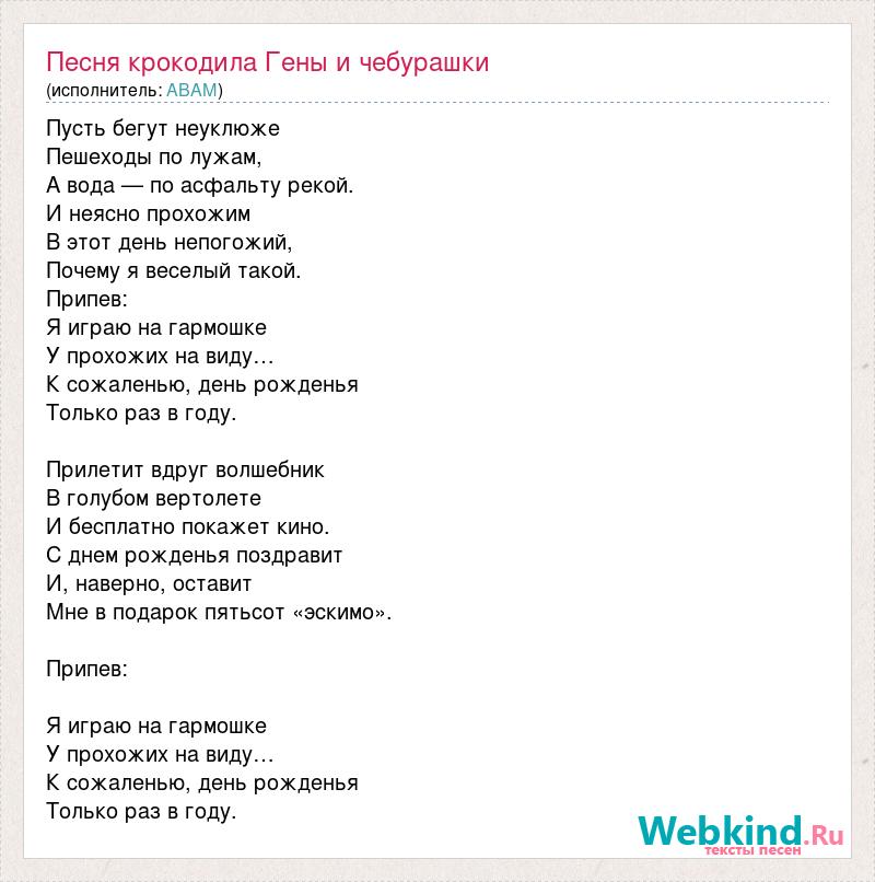 Пусть бегут неуклюже Пешеходы по лужам, А вода — по асфальту рекой. И неясно прохожим В этот день непогожий, Почему я веселый такой. Припев: Я играю на гармошке У прохожих на виду… К сожаленью, день рожденья Только раз в году. Прилетит вдруг волшебник В голубом вертолете И бесплатно покажет кино. С днем рожденья поздравит И, наверно, оставит Мне в подарок пятьсот «эскимо». Припев: Я играю на гармошке У прохожих на виду… К сожаленью, день рожденья Только раз в году.