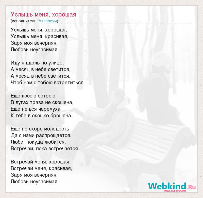 Услышь меня, хорошая, Услышь меня, красивая, Заря моя вечерняя, Любовь неугасимая. Иду я вдоль по улице, А месяц в небе светится, А месяц в небе светится, Чтоб нам с тобою встретиться. Еще косою острою В лугах трава не скошена, Еще не вся черемуха К тебе в окошко брошена. Еще не скоро молодость Да с нами распрощается. Люби, покуда любится, Встречай, пока встречается. Встречай меня, хорошая, Встречай меня, красивая, Заря моя вечерняя, Любовь неугасимая.
