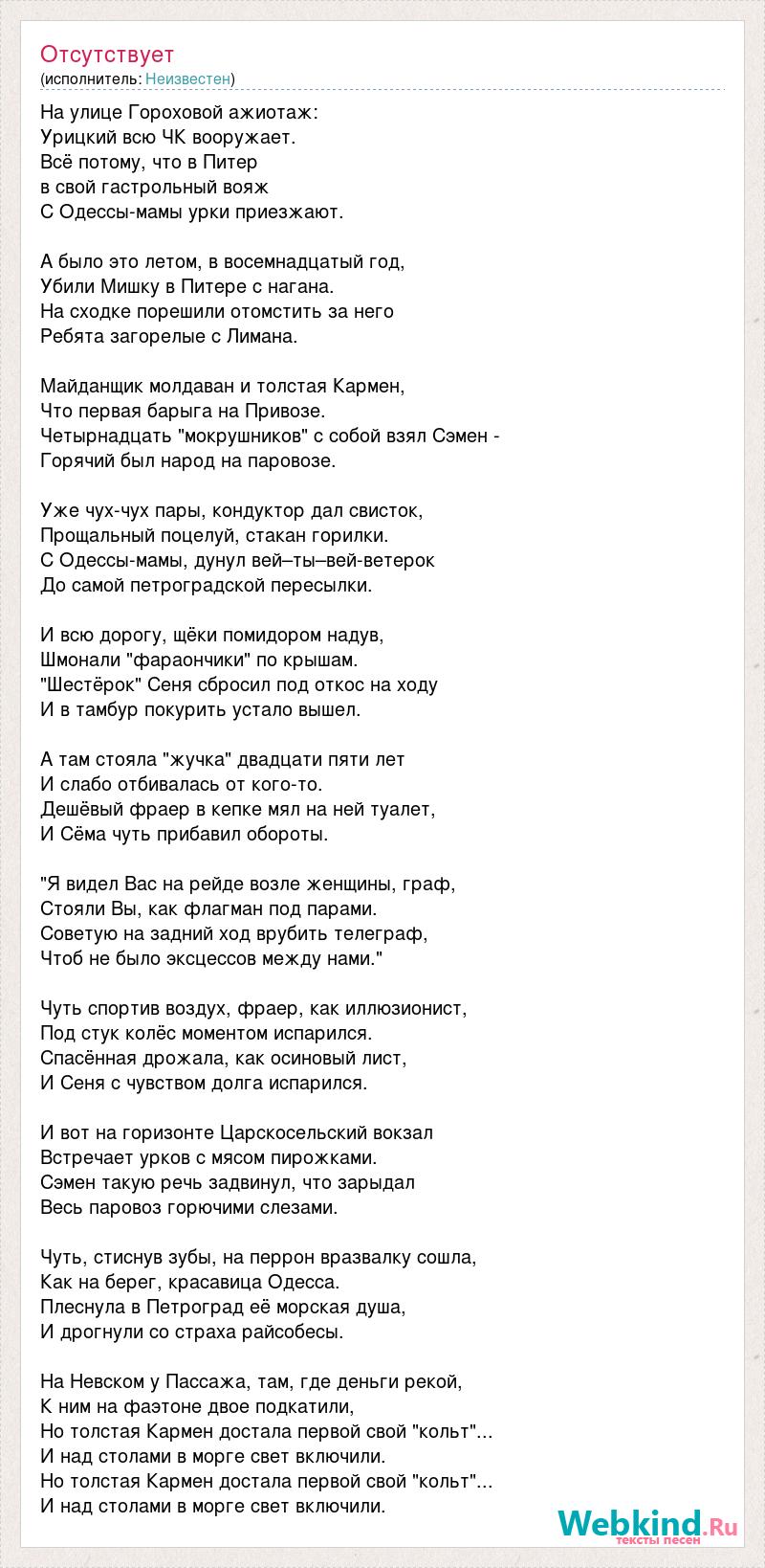 На улице Гороховой ажиотаж: Урицкий всю ЧК вооружает. Всё потому, что в Питер в свой гастрольный вояж С Одессы-мамы урки приезжают. А было это летом, в восемнадцатый год, Убили Мишку в Питере с нагана. На сходке порешили отомстить за него Ребята загорелые с Лимана. Майданщик молдаван и толстая Кармен, Что первая барыга на Привозе. Четырнадцать "мокрушников" с собой взял Сэмен - Горячий был народ на паровозе. Уже чух-чух пары, кондуктор дал свисток, Прощальный поцелуй, стакан горилки. С Одессы-мамы, дунул вей–ты–вей-ветерок До самой петроградской пересылки. И всю дорогу, щёки помидором надув, Шмонали "фараончики" по крышам. "Шестёрок" Сеня сбросил под откос на ходу И в тамбур покурить устало вышел. А там стояла "жучка" двадцати пяти лет И слабо отбивалась от кого-то. Дешёвый фраер в кепке мял на ней туалет, И Сёма чуть прибавил обороты. "Я видел Вас на рейде возле женщины, граф, Стояли Вы, как флагман под парами. Советую на задний ход врубить телеграф, Чтоб не было эксцессов между нами." Чуть спортив воздух, фраер, как иллюзионист, Под стук колёс моментом испарился. Спасённая дрожала, как осиновый лист, И Сеня с чувством долга испарился. И вот на горизонте Царскосельский вокзал Встречает урков с мясом пирожками. Сэмен такую речь задвинул, что зарыдал Весь паровоз горючими слезами. Чуть, стиснув зубы, на перрон вразвалку сошла, Как на берег, красавица Одесса. Плеснула в Петроград её морская душа, И дрогнули со страха райсобесы. На Невском у Пассажа, там, где деньги рекой, К ним на фаэтоне двое подкатили, Но толстая Кармен достала первой свой "кольт"... И над столами в морге свет включили. Но толстая Кармен достала первой свой "кольт"... И над столами в морге свет включили.