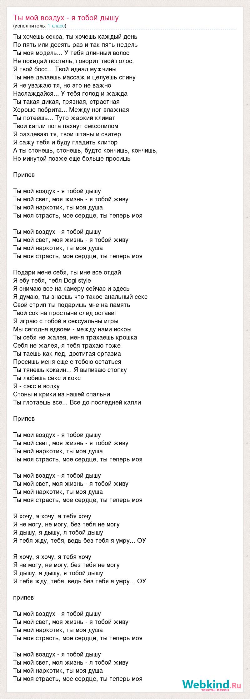 Ты хочешь секса, ты хочешь каждый день По пять или десять раз и так пять недель Ты моя модель... У тебя длинный волос Не покидай постель, говорит твой голос. Я твой босс... Твой идеал мужчины Ты мне делаешь массаж и целуешь спину Я не уважаю тя, но это не важно Наслаждайся... У тебя голод и жажда Ты такая дикая, грязная, страстная Хорошо побрита... Между ног влажная Ты потеешь... Туто жаркий климат Твои капли пота пахнут сексопилом Я раздеваю тя, твои штаны и свитер Я сажу тебя и буду гладить клитор А ты стонешь, стонешь, будто кончишь, кончишь, Но минутой позже еще больше просишь Припев Ты мой воздух - я тобой дышу Ты мой свет, моя жизнь - я тобой живу Ты мой наркотик, ты моя душа Ты моя страсть, мое сердце, ты теперь моя Ты мой воздух - я тобой дышу Ты мой свет, моя жизнь - я тобой живу Ты мой наркотик, ты моя душа Ты моя страсть, мое сердце, ты теперь моя Подари мене себя, ты мне все отдай Я ебу тебя, тебя Dogi style Я снимаю все на камеру сейчас и здесь Я думаю, ты знаешь что такое анальный секс Свой стрип ты подаришь мне на память Твой сок на простыне след оставит Я играю с тобой в сексуальны игры Мы сегодня вдвоем - между нами искры Ты себя не жалея, меня трахаешь крошка Себя не жалея, я тебя трахаю тоже Ты таешь как лед, достигая оргазма Просишь меня еще с тобою остаться Ты тянешь кокаин... Я выпиваю стопку Ты любишь секс и кокс Я - сэкс и водку Стоны и крики из нашей спальни Ты глотаешь все... Все до последней капли Припев Ты мой воздух - я тобой дышу Ты мой свет, моя жизнь - я тобой живу Ты мой наркотик, ты моя душа Ты моя страсть, мое сердце, ты теперь моя Ты мой воздух - я тобой дышу Ты мой свет, моя жизнь - я тобой живу Ты мой наркотик, ты моя душа Ты моя страсть, мое сердце, ты теперь моя Я хочу, я хочу, я тебя хочу Я не могу, не могу, без тебя не могу Я дышу, я дышу, я тобой дышу Я тебя жду, тебя, ведь без тебя я умру... ОУ Я хочу, я хочу, я тебя хочу Я не могу, не могу, без тебя не могу Я дышу, я дышу, я тобой дышу Я тебя жду, тебя, ведь без тебя я умру... ОУ припев Ты мой воздух - я тобой дышу Ты мой свет, моя жизнь - я тобой живу Ты мой наркотик, ты моя душа Ты моя страсть, мое сердце, ты теперь моя Ты мой воздух - я тобой дышу Ты мой свет, моя жизнь - я тобой живу Ты мой наркотик, ты моя душа Ты моя страсть, мое сердце, ты теперь моя