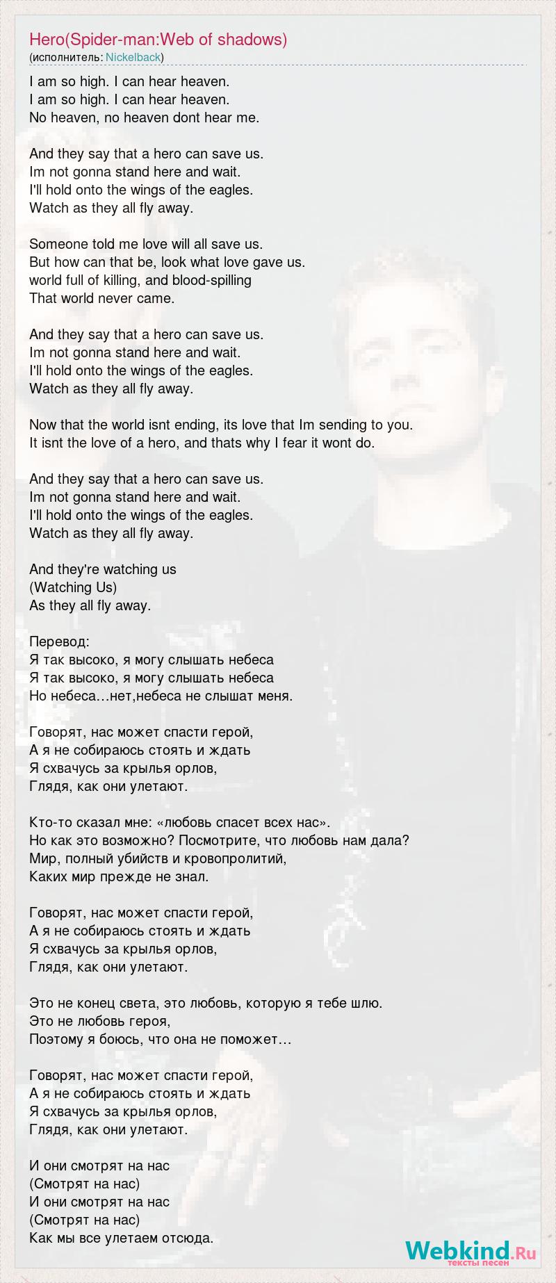 I am so high. I can hear heaven. I am so high. I can hear heaven. No heaven, no heaven dont hear me. And they say that a hero can save us. Im not gonna stand here and wait. I'll hold onto the wings of the eagles. Watch as they all fly away. Someone told me love will all save us. But how can that be, look what love gave us. world full of killing, and blood-spilling That world never came. And they say that a hero can save us. Im not gonna stand here and wait. I'll hold onto the wings of the eagles. Watch as they all fly away. Now that the world isnt ending, its love that Im sending to you. It isnt the love of a hero, and thats why I fear it wont do. And they say that a hero can save us. Im not gonna stand here and wait. I'll hold onto the wings of the eagles. Watch as they all fly away. And they're watching us (Watching Us) As they all fly away. Перевод: Я так высоко, я могу слышать небеса Я так высоко, я могу слышать небеса Но небеса…нет,небеса не слышат меня. Говорят, нас может спасти герой, А я не собираюсь стоять и ждать Я схвачусь за крылья орлов, Глядя, как они улетают. Кто-то сказал мне: «любовь спасет всех нас». Но как это возможно? Посмотрите, что любовь нам дала? Мир, полный убийств и кровопролитий, Каких мир прежде не знал. Говорят, нас может спасти герой, А я не собираюсь стоять и ждать Я схвачусь за крылья орлов, Глядя, как они улетают. Это не конец света, это любовь, которую я тебе шлю. Это не любовь героя, Поэтому я боюсь, что она не поможет… Говорят, нас может спасти герой, А я не собираюсь стоять и ждать Я схвачусь за крылья орлов, Глядя, как они улетают. И они смотрят на нас (Смотрят на нас) И они смотрят на нас (Смотрят на нас) Как мы все улетаем отсюда.