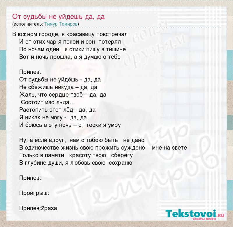 А как ты думаешь, о чем песня "От судьбы не уйдешь да, да" ?