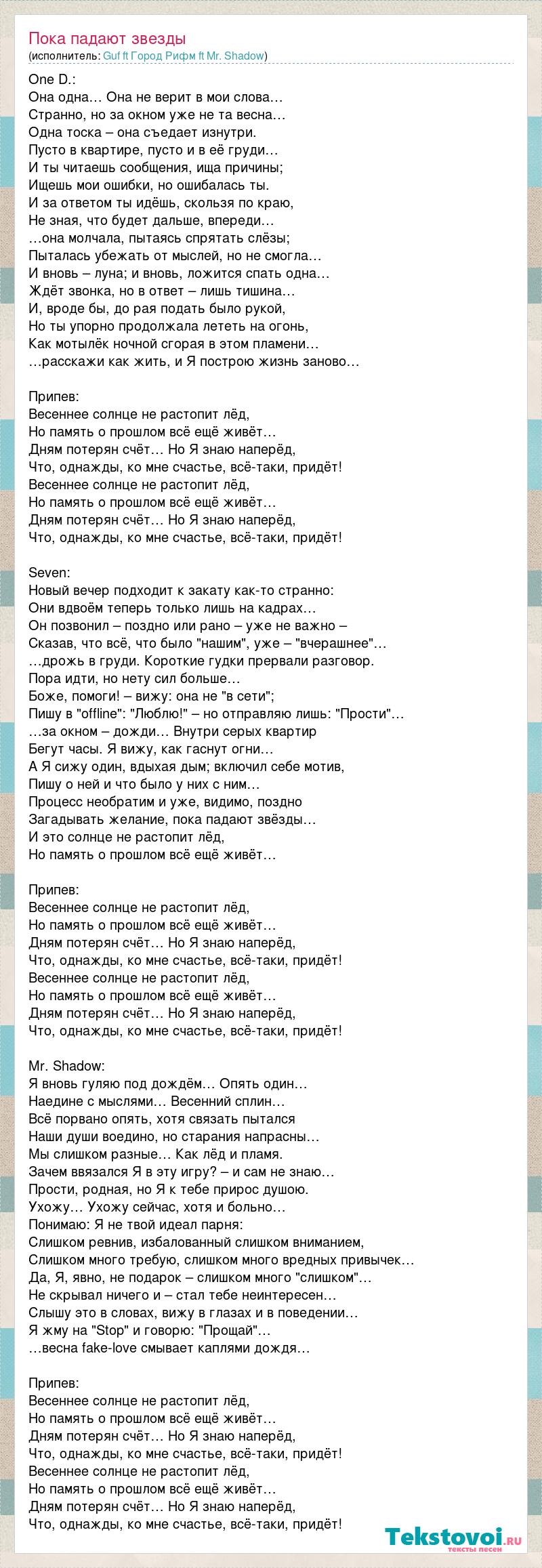 One D.: Она одна… Она не верит в мои слова… Странно, но за окном уже не та весна… Одна тоска – она съедает изнутри. Пусто в квартире, пусто и в её груди… И ты читаешь сообщения, ища причины; Ищешь мои ошибки, но ошибалась ты. И за ответом ты идёшь, скользя по краю, Не зная, что будет дальше, впереди… …она молчала, пытаясь спрятать слёзы; Пыталась убежать от мыслей, но не смогла… И вновь – луна; и вновь, ложится спать одна… Ждёт звонка, но в ответ – лишь тишина… И, вроде бы, до рая подать было рукой, Но ты упорно продолжала лететь на огонь, Как мотылёк ночной сгорая в этом пламени… …расскажи как жить, и Я построю жизнь заново… Припев: Весеннее солнце не растопит лёд, Но память о прошлом всё ещё живёт… Дням потерян счёт… Но Я знаю наперёд, Что, однажды, ко мне счастье, всё-таки, придёт! Весеннее солнце не растопит лёд, Но память о прошлом всё ещё живёт… Дням потерян счёт… Но Я знаю наперёд, Что, однажды, ко мне счастье, всё-таки, придёт! Seven: Новый вечер подходит к закату как-то странно: Они вдвоём теперь только лишь на кадрах… Он позвонил – поздно или рано – уже не важно – Сказав, что всё, что было "нашим", уже – "вчерашнее"… …дрожь в груди. Короткие гудки прервали разговор. Пора идти, но нету сил больше… Боже, помоги! – вижу: она не "в сети"; Пишу в "offline": "Люблю!" – но отправляю лишь: "Прости"… …за окном – дожди… Внутри серых квартир Бегут часы. Я вижу, как гаснут огни… А Я сижу один, вдыхая дым; включил себе мотив, Пишу о ней и что было у них с ним… Процесс необратим и уже, видимо, поздно Загадывать желание, пока падают звёзды… И это солнце не растопит лёд, Но память о прошлом всё ещё живёт… Припев: Весеннее солнце не растопит лёд, Но память о прошлом всё ещё живёт… Дням потерян счёт… Но Я знаю наперёд, Что, однажды, ко мне счастье, всё-таки, придёт! Весеннее солнце не растопит лёд, Но память о прошлом всё ещё живёт… Дням потерян счёт… Но Я знаю наперёд, Что, однажды, ко мне счастье, всё-таки, придёт! Mr. Shadow: Я вновь гуляю под дождём… Опять один… Наедине с мыслями… Весенний сплин… Всё порвано опять, хотя связать пытался Наши души воедино, но старания напрасны… Мы слишком разные… Как лёд и пламя. Зачем ввязался Я в эту игру? – и сам не знаю… Прости, родная, но Я к тебе прирос душою. Ухожу… Ухожу сейчас, хотя и больно… Понимаю: Я не твой идеал парня: Слишком ревнив, избалованный слишком вниманием, Слишком много требую, слишком много вредных привычек… Да, Я, явно, не подарок – слишком много "слишком"… Не скрывал ничего и – стал тебе неинтересен… Слышу это в словах, вижу в глазах и в поведении… Я жму на "Stop" и говорю: "Прощай"… …весна fake-love смывает каплями дождя… Припев: Весеннее солнце не растопит лёд, Но память о прошлом всё ещё живёт… Дням потерян счёт… Но Я знаю наперёд, Что, однажды, ко мне счастье, всё-таки, придёт! Весеннее солнце не растопит лёд, Но память о прошлом всё ещё живёт… Дням потерян счёт… Но Я знаю наперёд, Что, однажды, ко мне счастье, всё-таки, придёт!