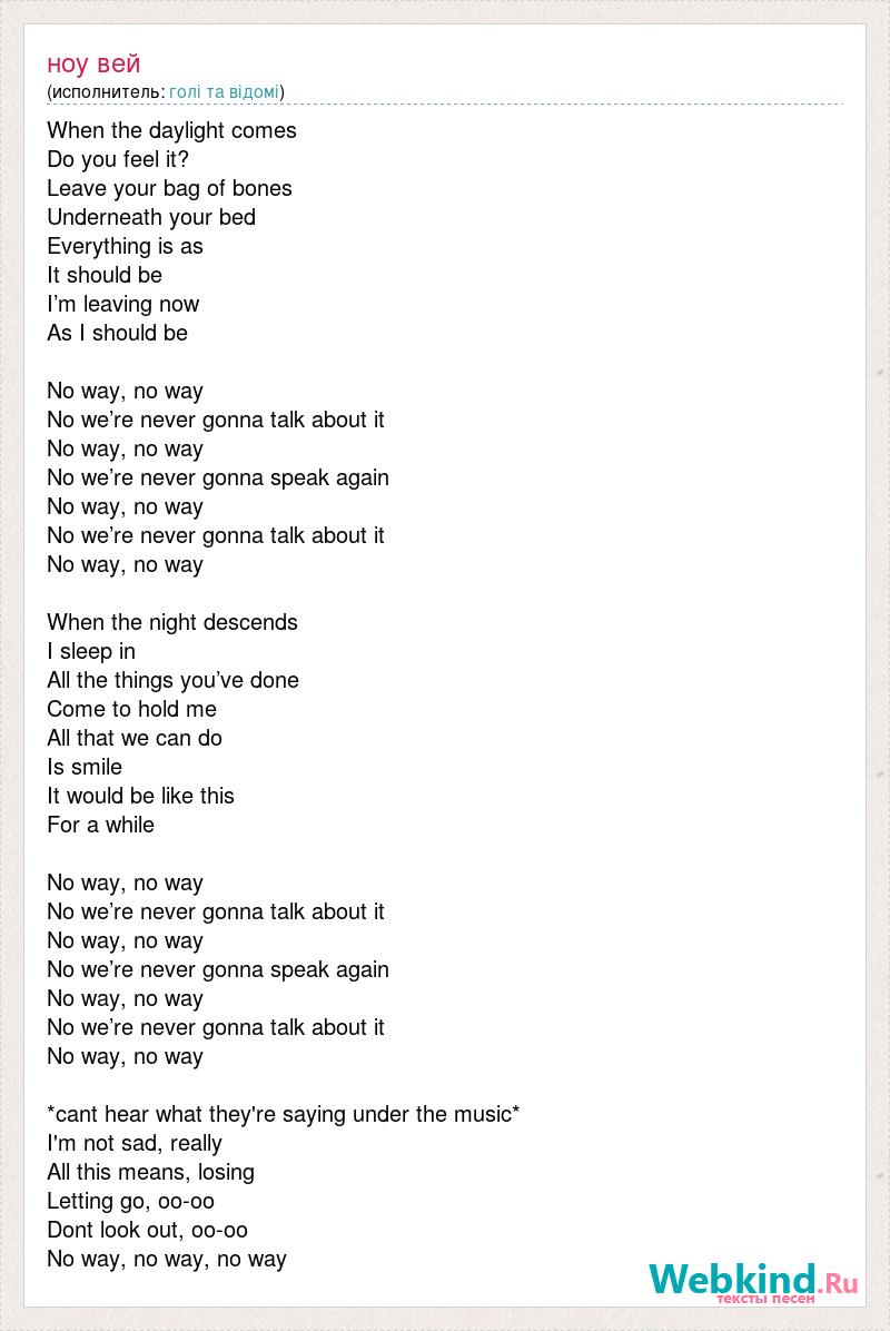 When the daylight comes Do you feel it? Leave your bag of bones Underneath your bed Everything is as It should be I’m leaving now As I should be No way, no way No we’re never gonna talk about it No way, no way No we’re never gonna speak again No way, no way No we’re never gonna talk about it No way, no way When the night descends I sleep in All the things you’ve done Come to hold me All that we can do Is smile It would be like this For a while No way, no way No we’re never gonna talk about it No way, no way No we’re never gonna speak again No way, no way No we’re never gonna talk about it No way, no way *cant hear what they're saying under the music* I'm not sad, really All this means, losing Letting go, oo-oo Dont look out, oo-oo No way, no way, no way