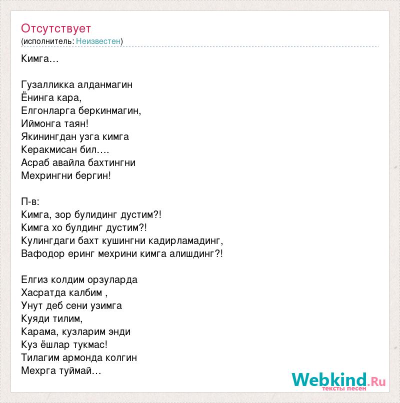 Кимга… Гузалликка алданмагин Ёнинга кара, Елгонларга беркинмагин, Иймонга таян! Якинингдан узга кимга Керакмисан бил…. Асраб авайла бахтингни Мехрингни бергин! П-в: Кимга, зор булидинг дустим?! Кимга хо булдинг дустим?! Кулингдаги бахт кушингни кадирламадинг, Вафодор еринг мехрини кимга алишдинг?! Елгиз колдим орзуларда Хасратда калбим , Унут деб сени узимга Куяди тилим, Карама, кузларим энди Куз ёшлар тукмас! Тилагим армонда колгин Мехрга туймай…