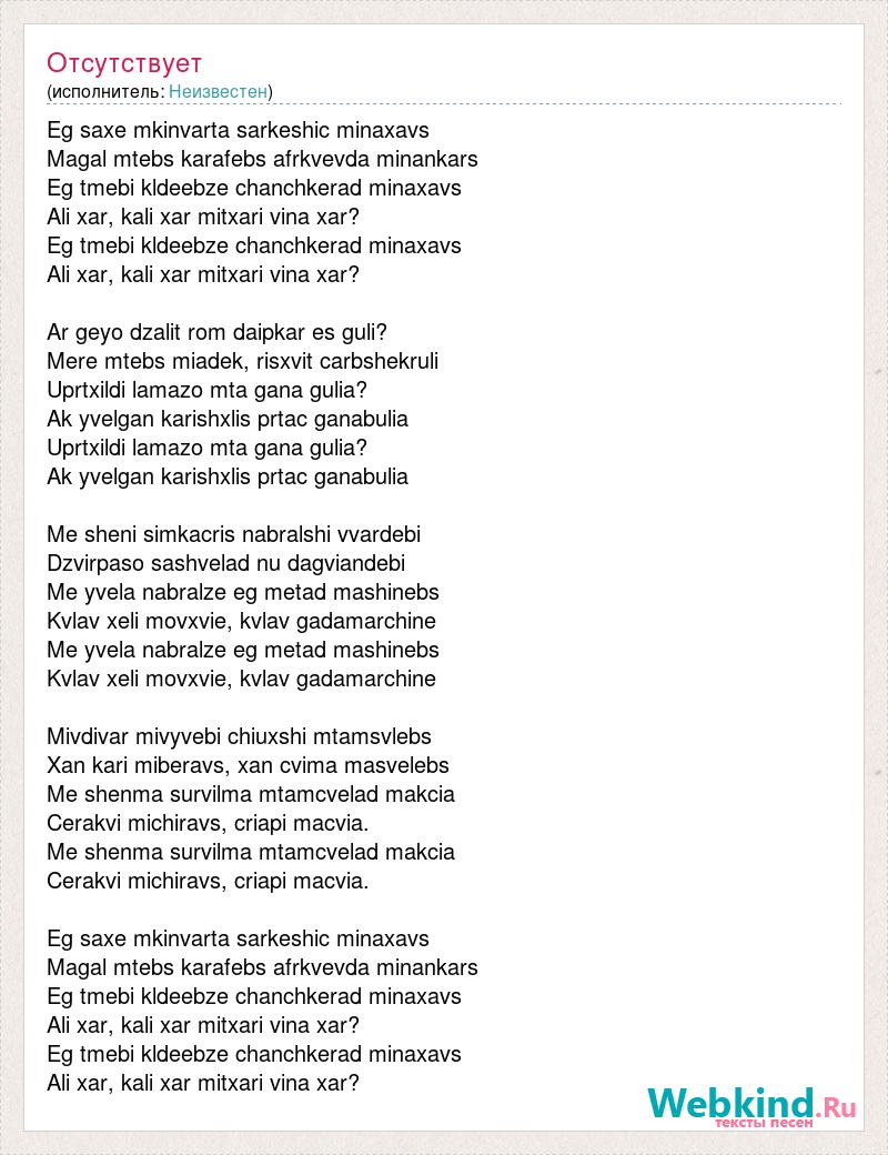 Eg saxe mkinvarta sarkeshic minaxavs Magal mtebs karafebs afrkvevda minankars Eg tmebi kldeebze chanchkerad minaxavs Ali xar, kali xar mitxari vina xar? Eg tmebi kldeebze chanchkerad minaxavs Ali xar, kali xar mitxari vina xar? Ar geyo dzalit rom daipkar es guli? Mere mtebs miadek, risxvit carbshekruli Uprtxildi lamazo mta gana gulia? Ak yvelgan karishxlis prtac ganabulia Uprtxildi lamazo mta gana gulia? Ak yvelgan karishxlis prtac ganabulia Me sheni simkacris nabralshi vvardebi Dzvirpaso sashvelad nu dagviandebi Me yvela nabralze eg metad mashinebs Kvlav xeli movxvie, kvlav gadamarchine Me yvela nabralze eg metad mashinebs Kvlav xeli movxvie, kvlav gadamarchine Mivdivar mivyvebi chiuxshi mtamsvlebs Xan kari miberavs, xan cvima masvelebs Me shenma survilma mtamcvelad makcia Cerakvi michiravs, criapi macvia. Me shenma survilma mtamcvelad makcia Cerakvi michiravs, criapi macvia. Eg saxe mkinvarta sarkeshic minaxavs Magal mtebs karafebs afrkvevda minankars Eg tmebi kldeebze chanchkerad minaxavs Ali xar, kali xar mitxari vina xar? Eg tmebi kldeebze chanchkerad minaxavs Ali xar, kali xar mitxari vina xar?