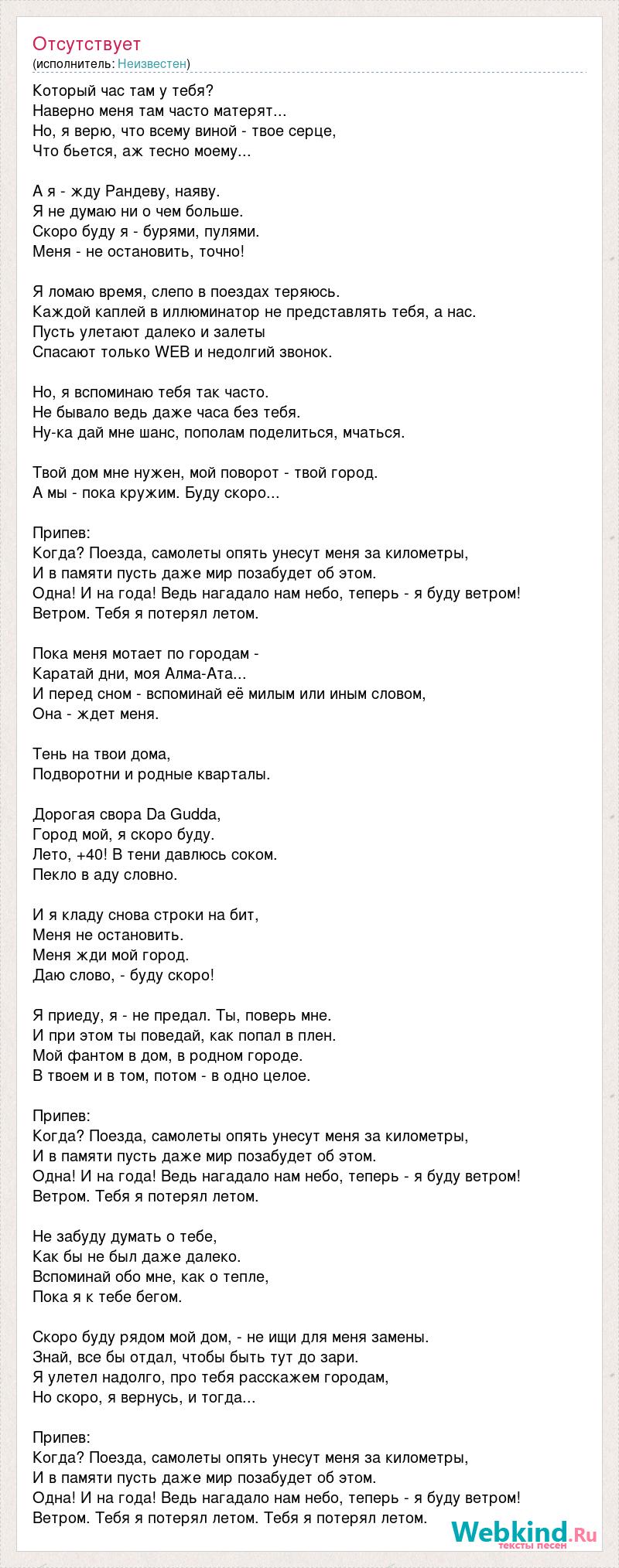 Который час там у тебя? Наверно меня там часто матерят... Но, я верю, что всему виной - твое серце, Что бьется, аж тесно моему... А я - жду Рандеву, наяву. Я не думаю ни о чем больше. Скоро буду я - бурями, пулями. Меня - не остановить, точно! Я ломаю время, слепо в поездах теряюсь. Каждой каплей в иллюминатор не представлять тебя, а нас. Пусть улетают далеко и залеты Спасают только WEB и недолгий звонок. Но, я вспоминаю тебя так часто. Не бывало ведь даже часа без тебя. Ну-ка дай мне шанс, пополам поделиться, мчаться. Твой дом мне нужен, мой поворот - твой город. А мы - пока кружим. Буду скоро... Припев: Когда? Поезда, самолеты опять унесут меня за километры, И в памяти пусть даже мир позабудет об этом. Одна! И на года! Ведь нагадало нам небо, теперь - я буду ветром! Ветром. Тебя я потерял летом. Пока меня мотает по городам - Каратай дни, моя Алма-Ата... И перед сном - вспоминай её милым или иным словом, Она - ждет меня. Тень на твои дома, Подворотни и родные кварталы. Дорогая свора Da Gudda, Город мой, я скоро буду. Лето, +40! В тени давлюсь соком. Пекло в аду словно. И я кладу снова строки на бит, Меня не остановить. Меня жди мой город. Даю слово, - буду скоро! Я приеду, я - не предал. Ты, поверь мне. И при этом ты поведай, как попал в плен. Мой фантом в дом, в родном городе. В твоем и в том, потом - в одно целое. Припев: Когда? Поезда, самолеты опять унесут меня за километры, И в памяти пусть даже мир позабудет об этом. Одна! И на года! Ведь нагадало нам небо, теперь - я буду ветром! Ветром. Тебя я потерял летом. Не забуду думать о тебе, Как бы не был даже далеко. Вспоминай обо мне, как о тепле, Пока я к тебе бегом. Скоро буду рядом мой дом, - не ищи для меня замены. Знай, все бы отдал, чтобы быть тут до зари. Я улетел надолго, про тебя расскажем городам, Но скоро, я вернусь, и тогда... Припев: Когда? Поезда, самолеты опять унесут меня за километры, И в памяти пусть даже мир позабудет об этом. Одна! И на года! Ведь нагадало нам небо, теперь - я буду ветром! Ветром. Тебя я потерял летом. Тебя я потерял летом.