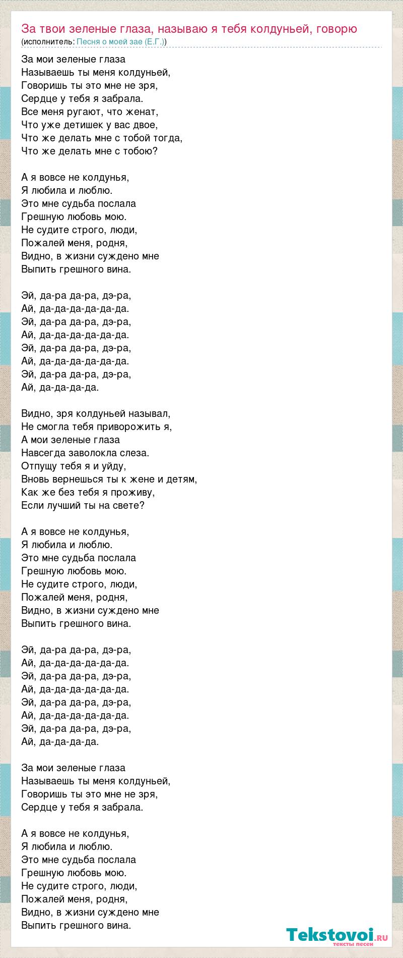 За мои зеленые глаза Называешь ты меня колдуньей, Говоришь ты это мне не зря, Сердце у тебя я забрала. Все меня ругают, что женат, Что уже детишек у вас двое, Что же делать мне с тобой тогда, Что же делать мне с тобою? А я вовсе не колдунья, Я любила и люблю. Это мне судьба послала Грешную любовь мою. Не судите строго, люди, Пожалей меня, родня, Видно, в жизни суждено мне Выпить грешного вина. Эй, да-ра да-ра, дэ-ра, Ай, да-да-да-да-да-да. Эй, да-ра да-ра, дэ-ра, Ай, да-да-да-да-да-да. Эй, да-ра да-ра, дэ-ра, Ай, да-да-да-да-да-да. Эй, да-ра да-ра, дэ-ра, Ай, да-да-да-да. Видно, зря колдуньей называл, Не смогла тебя приворожить я, А мои зеленые глаза Навсегда заволокла слеза. Отпущу тебя я и уйду, Вновь вернешься ты к жене и детям, Как же без тебя я проживу, Если лучший ты на свете? А я вовсе не колдунья, Я любила и люблю. Это мне судьба послала Грешную любовь мою. Не судите строго, люди, Пожалей меня, родня, Видно, в жизни суждено мне Выпить грешного вина. Эй, да-ра да-ра, дэ-ра, Ай, да-да-да-да-да-да. Эй, да-ра да-ра, дэ-ра, Ай, да-да-да-да-да-да. Эй, да-ра да-ра, дэ-ра, Ай, да-да-да-да-да-да. Эй, да-ра да-ра, дэ-ра, Ай, да-да-да-да. За мои зеленые глаза Называешь ты меня колдуньей, Говоришь ты это мне не зря, Сердце у тебя я забрала. А я вовсе не колдунья, Я любила и люблю. Это мне судьба послала Грешную любовь мою. Не судите строго, люди, Пожалей меня, родня, Видно, в жизни суждено мне Выпить грешного вина.