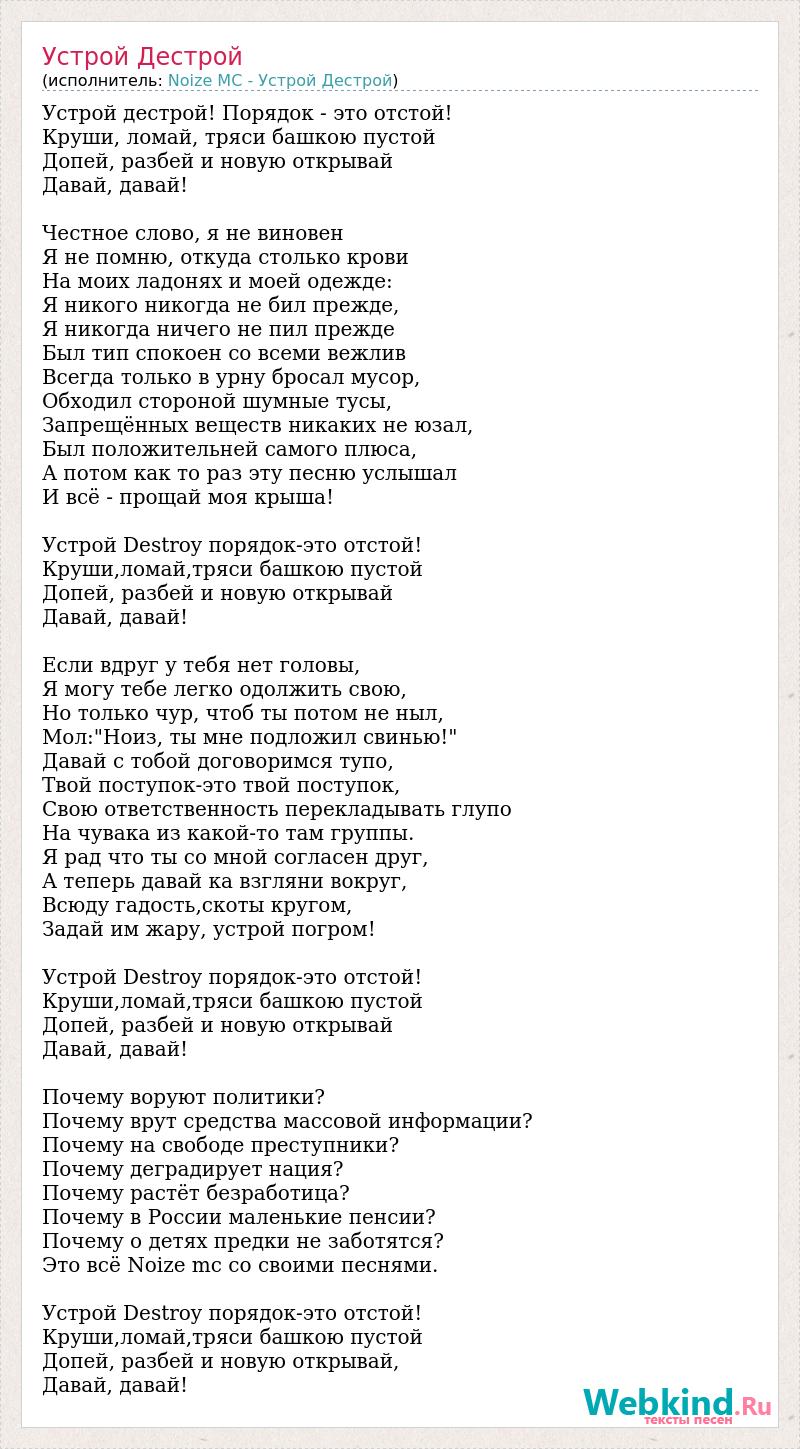 Устрой дестрой! Порядок - это отстой! Круши, ломай, тряси башкою пустой Допей, разбей и новую открывай Давай, давай! Честное слово, я не виновен Я не помню, откуда столько крови На моих ладонях и моей одежде: Я никого никогда не бил прежде, Я никогда ничего не пил прежде Был тип спокоен со всеми вежлив Всегда только в урну бросал мусор, Обходил стороной шумные тусы, Запрещённых веществ никаких не юзал, Был положительней самого плюса, А потом как то раз эту песню услышал И всё - прощай моя крыша! Устрой Destroy порядок-это отстой! Круши,ломай,тряси башкою пустой Допей, разбей и новую открывай Давай, давай! Если вдруг у тебя нет головы, Я могу тебе легко одолжить свою, Но только чур, чтоб ты потом не ныл, Мол:"Ноиз, ты мне подложил свинью!" Давай с тобой договоримся тупо, Твой поступок-это твой поступок, Свою ответственность перекладывать глупо На чувака из какой-то там группы. Я рад что ты со мной согласен друг, А теперь давай ка взгляни вокруг, Всюду гадость,скоты кругом, Задай им жару, устрой погром! Устрой Destroy порядок-это отстой! Круши,ломай,тряси башкою пустой Допей, разбей и новую открывай Давай, давай! Почему воруют политики? Почему врут средства массовой информации? Почему на свободе преступники? Почему деградирует нация? Почему растёт безработица? Почему в России маленькие пенсии? Почему о детях предки не заботятся? Это всё Noize mc со своими песнями. Устрой Destroy порядок-это отстой! Круши,ломай,тряси башкою пустой Допей, разбей и новую открывай, Давай, давай!