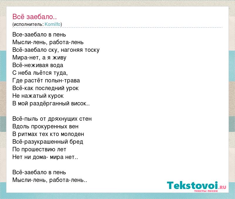 Все-заебало в пень Мысли-лень, работа-лень Всё-заебало ску, нагоняя тоску Мира-нет, а я живу Всё-неживая вода С неба льётся туда, Где растёт полын-трава Всё-как последний урок Не нажатый курок В мой раздёрганный висок.. Всё-пыль от дряхнущих стен Вдоль прокуренных вен В ритмах тех кто молоден Всё-разукрашенный бред По прошествию лет Нет ни дома- мира нет.. Всё-заебало в пень Мысли-лень, работа-лень..