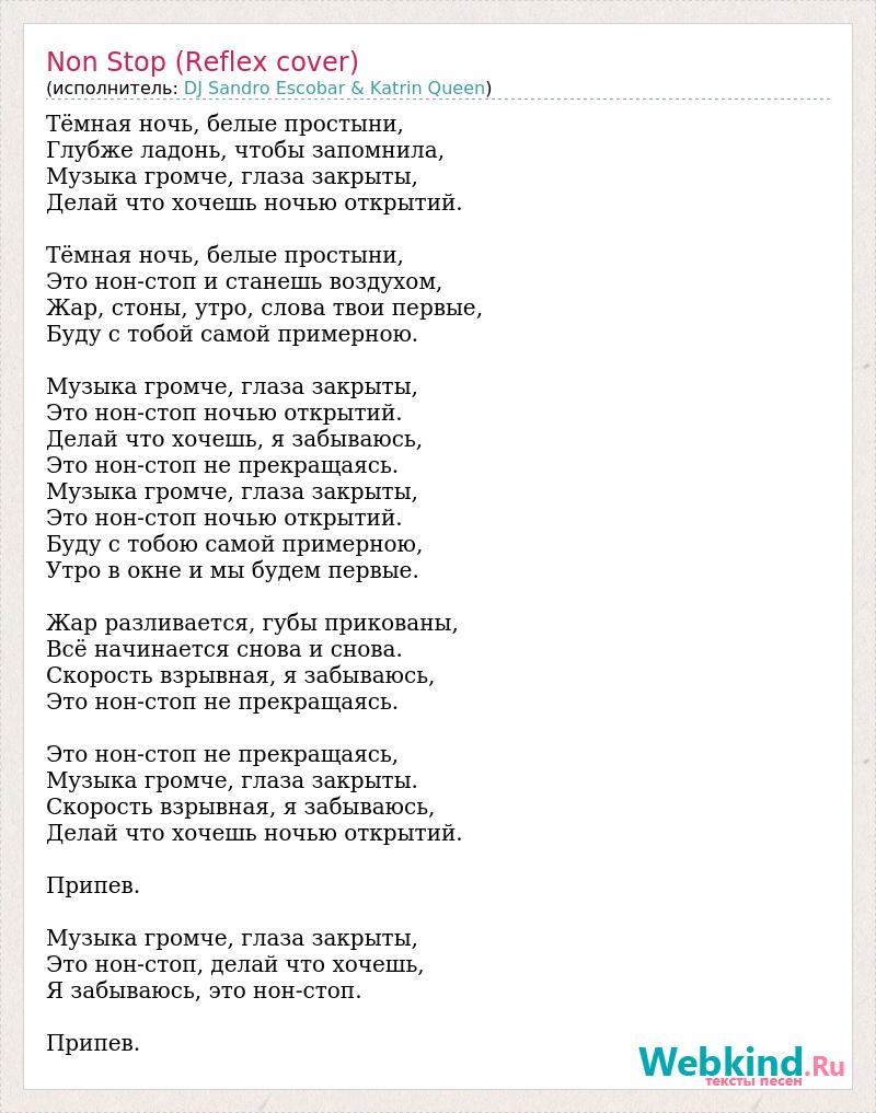 Тёмная ночь, белые простыни, Глубже ладонь, чтобы запомнила, Музыка громче, глаза закрыты, Делай что хочешь ночью открытий. Тёмная ночь, белые простыни, Это нон-стоп и станешь воздухом, Жар, стоны, утро, слова твои первые, Буду с тобой самой примерною. Музыка громче, глаза закрыты, Это нон-стоп ночью открытий. Делай что хочешь, я забываюсь, Это нон-стоп не прекращаясь. Музыка громче, глаза закрыты, Это нон-стоп ночью открытий. Буду с тобою самой примерною, Утро в окне и мы будем первые. Жар разливается, губы прикованы, Всё начинается снова и снова. Скорость взрывная, я забываюсь, Это нон-стоп не прекращаясь. Это нон-стоп не прекращаясь, Музыка громче, глаза закрыты. Скорость взрывная, я забываюсь, Делай что хочешь ночью открытий. Припев. Музыка громче, глаза закрыты, Это нон-стоп, делай что хочешь, Я забываюсь, это нон-стоп. Припев.
