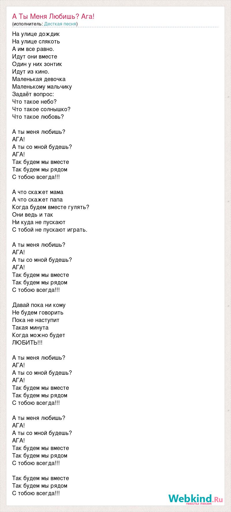 На улице дождик На улице слякоть А им все равно. Идут они вместе Один у них зонтик Идут из кино. Маленькая девочка Маленькому мальчику Задаёт вопрос: Что такое небо? Что такое солнышко? Что такое любовь? А ты меня любишь? АГА! А ты со мной будешь? АГА! Так будем мы вместе Так будем мы рядом С тобою всегда!!! А что скажет мама А что скажет папа Когда будем вместе гулять? Они ведь и так Ни куда не пускают С тобой не пускают играть. А ты меня любишь? АГА! А ты со мной будешь? АГА! Так будем мы вместе Так будем мы рядом С тобою всегда!!! Давай пока ни кому Не будем говорить Пока не наступит Такая минута Когда можно будет ЛЮБИТЬ!!! А ты меня любишь? АГА! А ты со мной будешь? АГА! Так будем мы вместе Так будем мы рядом С тобою всегда!!! А ты меня любишь? АГА! А ты со мной будешь? АГА! Так будем мы вместе Так будем мы рядом С тобою всегда!!! Так будем мы вместе Так будем мы рядом С тобою всегда!!!