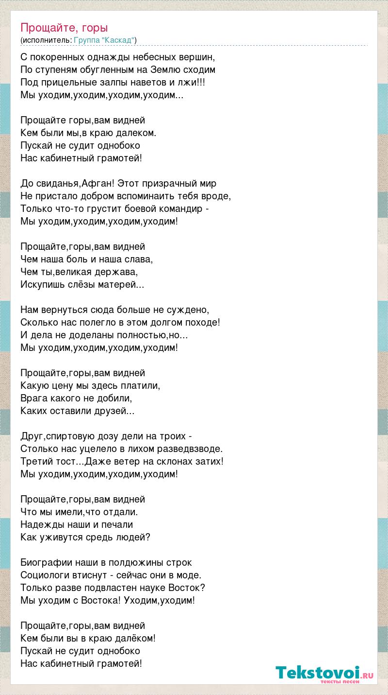 С покоренных однажды небесных вершин, По ступеням обугленным на Землю сходим Под прицельные залпы наветов и лжи!!! Мы уходим,уходим,уходим,уходим... Прощайте горы,вам видней Кем были мы,в краю далеком. Пускай не судит однобоко Нас кабинетный грамотей! До свиданья,Афган! Этот призрачный мир Не пристало добром вспоминаить тебя вроде, Только что-то грустит боевой командир - Мы уходим,уходим,уходим,уходим! Прощайте,горы,вам видней Чем наша боль и наша слава, Чем ты,великая держава, Искупишь слёзы матерей... Нам вернуться сюда больше не суждено, Сколько нас полегло в этом долгом походе! И дела не доделаны полностью,но... Мы уходим,уходим,уходим,уходим! Прощайте,горы,вам видней Какую цену мы здесь платили, Врага какого не добили, Каких оставили друзей... Друг,спиртовую дозу дели на троих - Столько нас уцелело в лихом разведвзводе. Третий тост...Даже ветер на склонах затих! Мы уходим,уходим,уходим,уходим! Прощайте,горы,вам видней Что мы имели,что отдали. Надежды наши и печали Как уживутся средь людей? Биографии наши в полдюжины строк Социологи втиснут - сейчас они в моде. Только разве подвластен науке Восток? Мы уходим с Востока! Уходим,уходим! Прощайте,горы,вам видней Кем были вы в краю далёком! Пускай не судит однобоко Нас кабинетный грамотей!