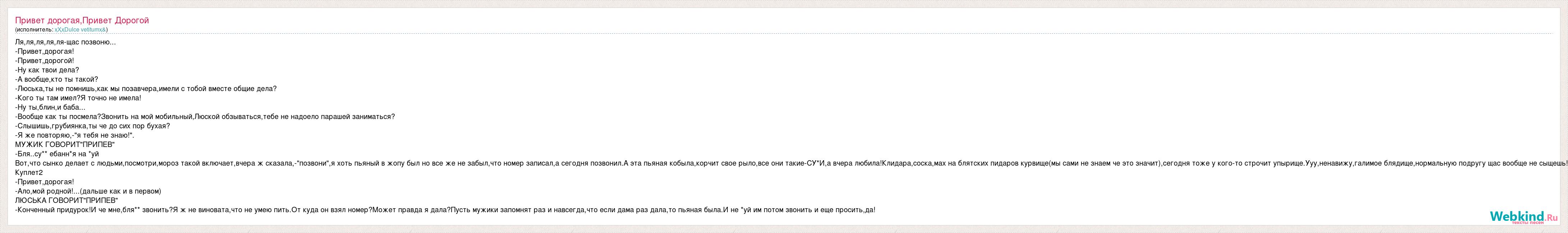 Ля,ля,ля,ля,ля-щас позвоню... -Привет,дорогая! -Привет,дорогой! -Ну как твои дела? -А вообще,кто ты такой? -Люська,ты не помнишь,как мы позавчера,имели с тобой вместе общие дела? -Кого ты там имел?Я точно не имела! -Ну ты,блин,и баба... -Вообще как ты посмела?Звонить на мой мобильный,Люской обзываться,тебе не надоело парашей заниматься? -Слышишь,грубиянка,ты че до сих пор бухая? -Я же повторяю,-"я тебя не знаю!". МУЖИК ГОВОРИТ"ПРИПЕВ" -Бля..су** ебанн*я на *уй Вот,что сынко делает с людьми,посмотри,мороз такой включает,вчера ж сказала,-"позвони",я хоть пьяный в жопу был но все же не забыл,что номер записал,а сегодня позвонил.А эта пьяная кобыла,корчит свое рыло,все они такие-СУ*И,а вчера любила!Клидара,соска,мах на блятских пидаров курвище(мы сами не знаем че это значит),сегодня тоже у кого-то строчит упырище.Ууу,ненавижу,галимое блядище,нормальную подругу щас вообще не сыщешь! Куплет2 -Привет,дорогая! -Ало,мой родной!...(дальше как и в первом) ЛЮСЬКА ГОВОРИТ"ПРИПЕВ" -Конченный придурок!И че мне,бля** звонить?Я ж не виновата,что не умею пить.От куда он взял номер?Может правда я дала?Пусть мужики запомнят раз и навсегда,что если дама раз дала,то пьяная была.И не *уй им потом звонить и еще просить,да!
