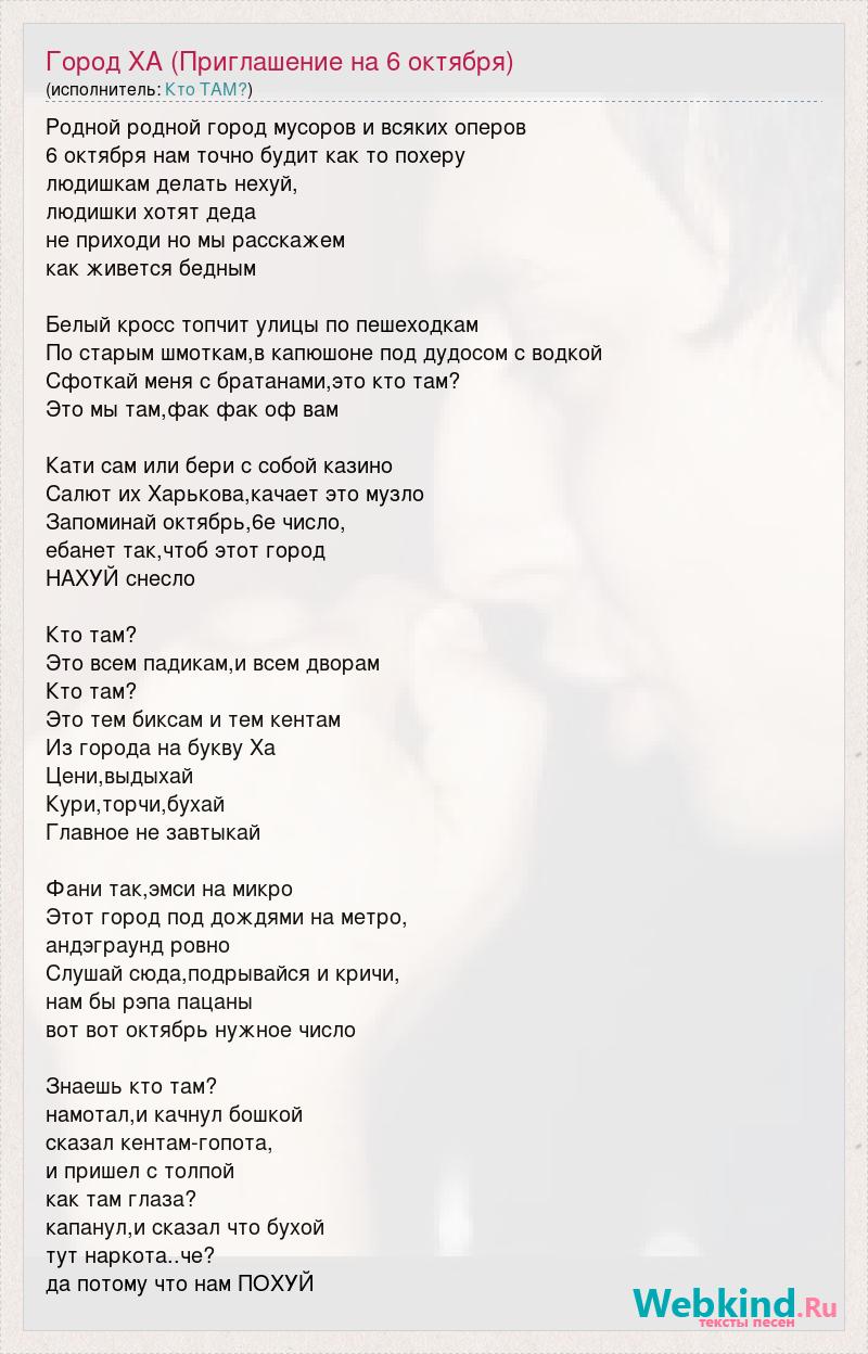 Родной родной город мусоров и всяких оперов 6 октября нам точно будит как то похеру людишкам делать нехуй, людишки хотят деда не приходи но мы расскажем как живется бедным Белый кросс топчит улицы по пешеходкам По старым шмоткам,в капюшоне под дудосом с водкой Сфоткай меня с братанами,это кто там? Это мы там,фак фак оф вам Кати сам или бери с собой казино Салют их Харькова,качает это музло Запоминай октябрь,6е число, ебанет так,чтоб этот город НАХУЙ снесло Кто там? Это всем падикам,и всем дворам Кто там? Это тем биксам и тем кентам Из города на букву Ха Цени,выдыхай Кури,торчи,бухай Главное не завтыкай Фани так,эмси на микро Этот город под дождями на метро, андэграунд ровно Слушай сюда,подрывайся и кричи, нам бы рэпа пацаны вот вот октябрь нужное число Знаешь кто там? намотал,и качнул бошкой сказал кентам-гопота, и пришел с толпой как там глаза? капанул,и сказал что бухой тут наркота..че? да потому что нам ПОХУЙ