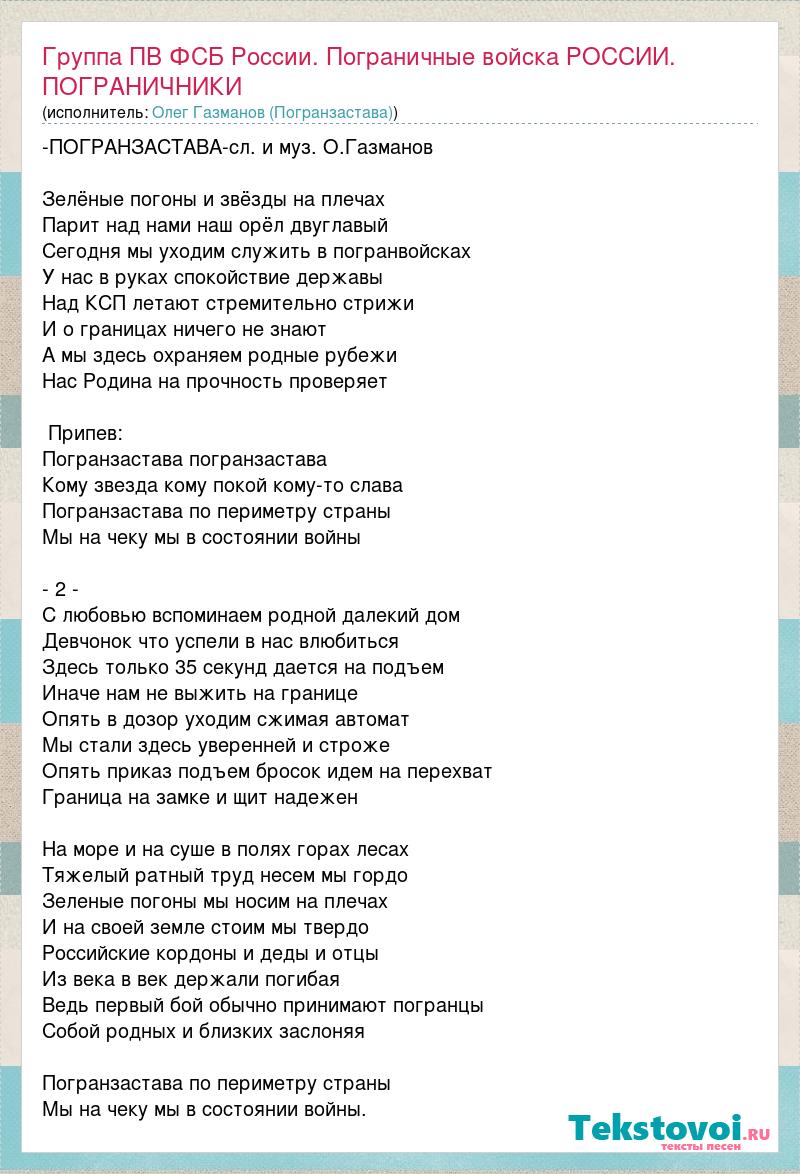 -ПОГРАНЗАСТАВА-сл. и муз. О.Газманов Зелёные погоны и звёзды на плечах Парит над нами наш орёл двуглавый Сегодня мы уходим служить в погранвойсках У нас в руках спокойствие державы Над КСП летают стремительно стрижи И о границах ничего не знают А мы здесь охраняем родные рубежи Нас Родина на прочность проверяет Припев: Погранзастава погранзастава Кому звезда кому покой кому-то слава Погранзастава по периметру страны Мы на чеку мы в состоянии войны - 2 - С любовью вспоминаем родной далекий дом Девчонок что успели в нас влюбиться Здесь только 35 секунд дается на подъем Иначе нам не выжить на границе Опять в дозор уходим сжимая автомат Мы стали здесь уверенней и строже Опять приказ подъем бросок идем на перехват Граница на замке и щит надежен На море и на суше в полях горах лесах Тяжелый ратный труд несем мы гордо Зеленые погоны мы носим на плечах И на своей земле стоим мы твердо Российские кордоны и деды и отцы Из века в век держали погибая Ведь первый бой обычно принимают погранцы Собой родных и близких заслоняя Погранзастава по периметру страны Мы на чеку мы в состоянии войны.