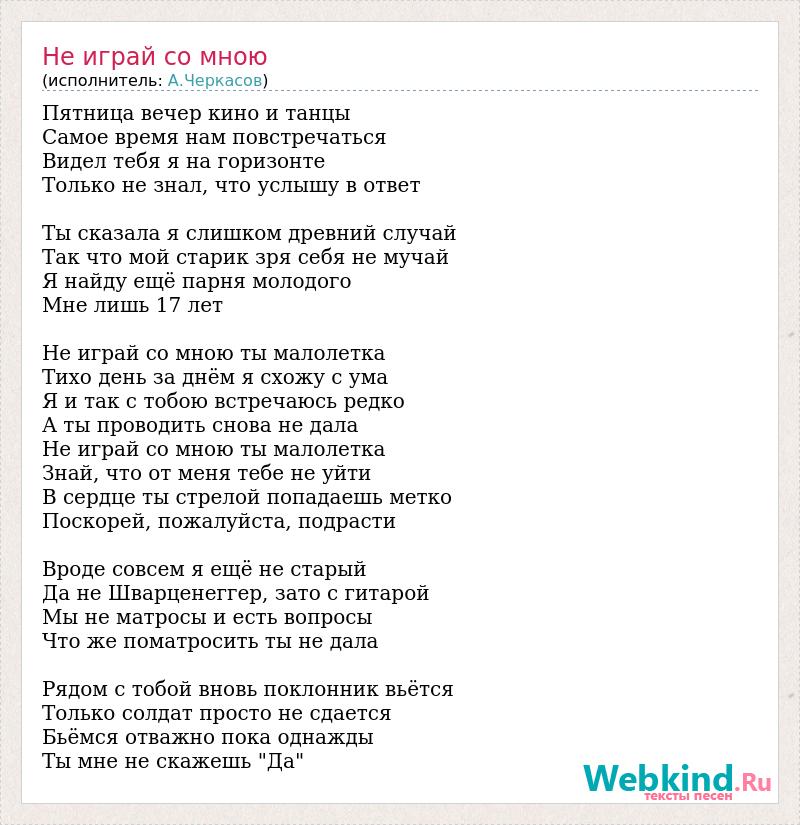 Пятница вечер кино и танцы Самое время нам повстречаться Видел тебя я на горизонте Только не знал, что услышу в ответ Ты сказала я слишком древний случай Так что мой старик зря себя не мучай Я найду ещё парня молодого Мне лишь 17 лет Не играй со мною ты малолетка Тихо день за днём я схожу с ума Я и так с тобою встречаюсь редко А ты проводить снова не дала Не играй со мною ты малолетка Знай, что от меня тебе не уйти В сердце ты стрелой попадаешь метко Поскорей, пожалуйста, подрасти Вроде совсем я ещё не старый Да не Шварценеггер, зато с гитарой Мы не матросы и есть вопросы Что же поматросить ты не дала Рядом с тобой вновь поклонник вьётся Только солдат просто не сдается Бьёмся отважно пока однажды Ты мне не скажешь "Да"