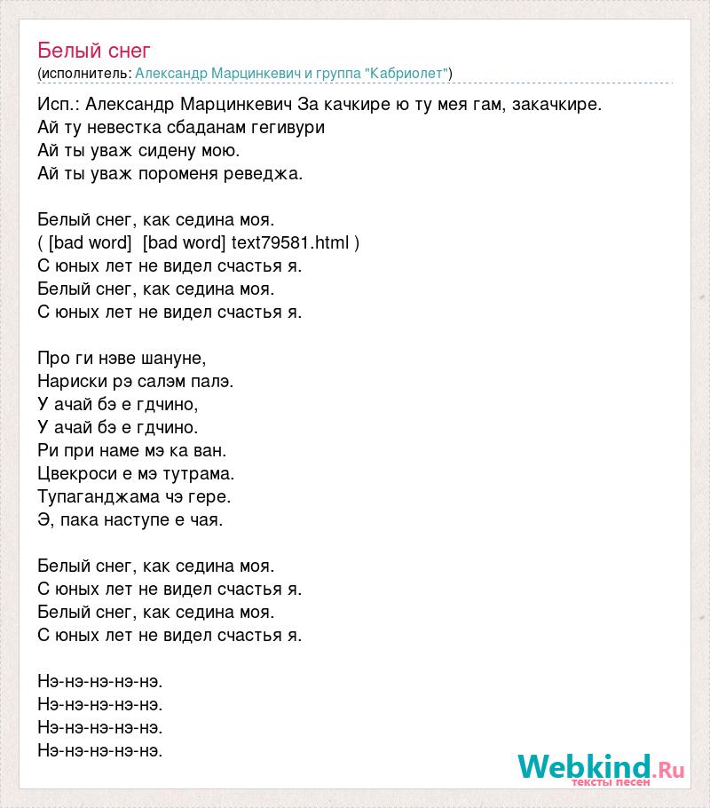 Исп.: Александр Марцинкевич За качкире ю ту мея гам, закачкире. Ай ту невестка сбаданам гегивури Ай ты уваж сидену мою. Ай ты уваж пороменя реведжа. Белый снег, как седина моя. ( [bad word] [bad word] text79581.html ) С юных лет не видел счастья я. Белый снег, как седина моя. С юных лет не видел счастья я. Про ги нэве шануне, Нариски рэ салэм палэ. У ачай бэ е гдчино, У ачай бэ е гдчино. Ри при наме мэ ка ван. Цвекроси е мэ тутрама. Тупаганджама чэ гере. Э, пака наступе е чая. Белый снег, как седина моя. С юных лет не видел счастья я. Белый снег, как седина моя. С юных лет не видел счастья я. Нэ-нэ-нэ-нэ-нэ. Нэ-нэ-нэ-нэ-нэ. Нэ-нэ-нэ-нэ-нэ. Нэ-нэ-нэ-нэ-нэ.