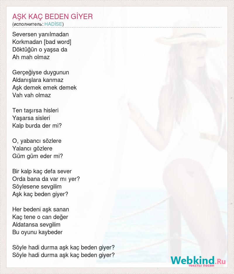 Seversen yanılmadan Korkmadan [bad word] Döktüğün o yaşsa da Ah mah olmaz Gerçeğiyse duygunun Aldanışlara kanmaz Aşk demek emek demek Vah vah olmaz Ten taşırsa hisleri Yaşarsa sisleri Kalp burda der mi? O, yabancı sözlere Yalancı gözlere Güm güm eder mi? Bir kalp kaç defa sever Orda bana da var mı yer? Söylesene sevgilim Aşk kaç beden giyer? Her bedeni aşk sanan Kaç tene o can değer Aldatansa sevgilim Bu oyunu kaybeder Söyle hadi durma aşk kaç beden giyer? Söyle hadi durma aşk kaç beden giyer?