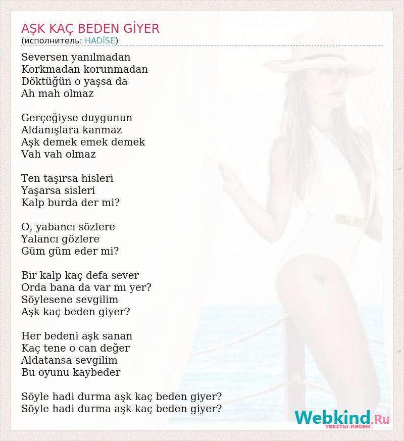 Seversen yanılmadan Korkmadan korunmadan Döktüğün o yaşsa da Ah mah olmaz Gerçeğiyse duygunun Aldanışlara kanmaz Aşk demek emek demek Vah vah olmaz Ten taşırsa hisleri Yaşarsa sisleri Kalp burda der mi? O, yabancı sözlere Yalancı gözlere Güm güm eder mi? Bir kalp kaç defa sever Orda bana da var mı yer? Söylesene sevgilim Aşk kaç beden giyer? Her bedeni aşk sanan Kaç tene o can değer Aldatansa sevgilim Bu oyunu kaybeder Söyle hadi durma aşk kaç beden giyer? Söyle hadi durma aşk kaç beden giyer?