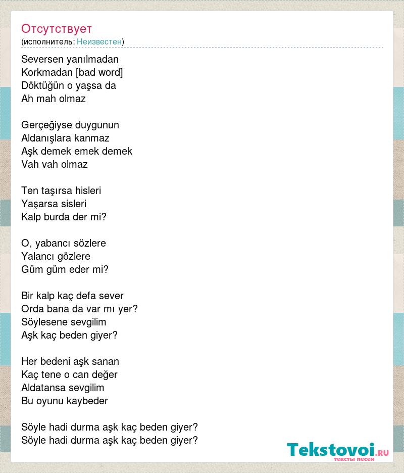 Seversen yanılmadan Korkmadan korunmadan Döktüğün o yaşsa da Ah mah olmaz Gerçeğiyse duygunun Aldanışlara kanmaz Aşk demek emek demek Vah vah olmaz Ten taşırsa hisleri Yaşarsa sisleri Kalp burda der mi? O, yabancı sözlere Yalancı gözlere Güm güm eder mi? Bir kalp kaç defa sever Orda bana da var mı yer? Söylesene sevgilim Aşk kaç beden giyer? Her bedeni aşk sanan Kaç tene o can değer Aldatansa sevgilim Bu oyunu kaybeder Söyle hadi durma aşk kaç beden giyer? Söyle hadi durma aşk kaç beden giyer?