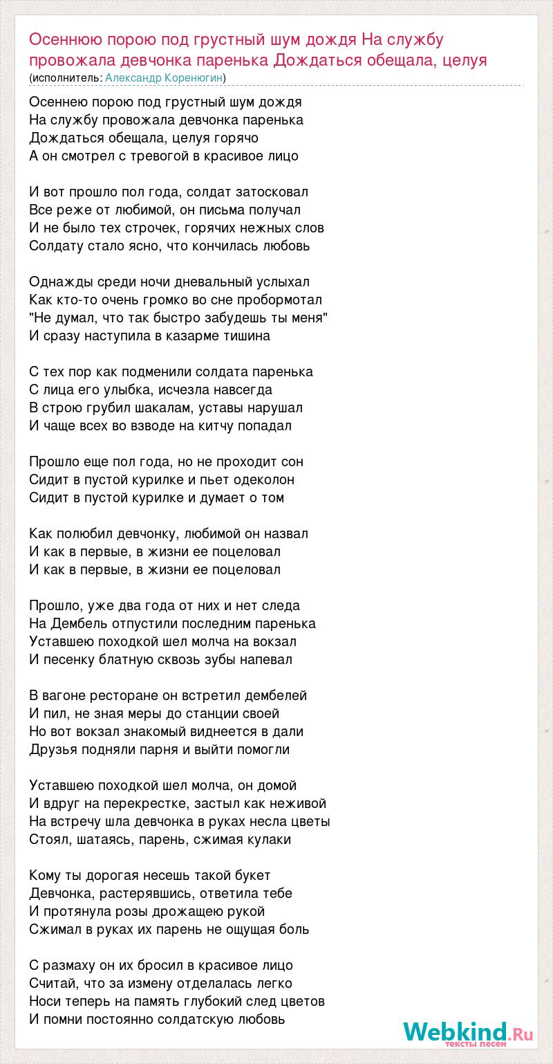 Осеннею порою под грустный шум дождя На службу провожала девчонка паренька Дождаться обещала, целуя горячо А он смотрел с тревогой в красивое лицо И вот прошло пол года, солдат затосковал Все реже от любимой, он письма получал И не было тех строчек, горячих нежных слов Солдату стало ясно, что кончилась любовь Однажды среди ночи дневальный услыхал Как кто-то очень громко во сне пробормотал "Не думал, что так быстро забудешь ты меня" И сразу наступила в казарме тишина С тех пор как подменили солдата паренька С лица его улыбка, исчезла навсегда В строю грубил шакалам, уставы нарушал И чаще всех во взводе на китчу попадал Прошло еще пол года, но не проходит сон Сидит в пустой курилке и пьет одеколон Сидит в пустой курилке и думает о том Как полюбил девчонку, любимой он назвал И как в первые, в жизни ее поцеловал И как в первые, в жизни ее поцеловал Прошло, уже два года от них и нет следа На Дембель отпустили последним паренька Уставшею походкой шел молча на вокзал И песенку блатную сквозь зубы напевал В вагоне ресторане он встретил дембелей И пил, не зная меры до станции своей Но вот вокзал знакомый виднеется в дали Друзья подняли парня и выйти помогли Уставшею походкой шел молча, он домой И вдруг на перекрестке, застыл как неживой На встречу шла девчонка в руках несла цветы Стоял, шатаясь, парень, сжимая кулаки Кому ты дорогая несешь такой букет Девчонка, растерявшись, ответила тебе И протянула розы дрожащею рукой Сжимал в руках их парень не ощущая боль С размаху он их бросил в красивое лицо Считай, что за измену отделалась легко Носи теперь на память глубокий след цветов И помни постоянно солдатскую любовь