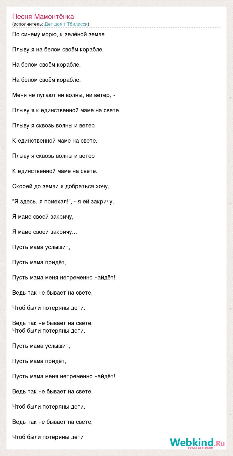 По синему морю, к зелёной земле Плыву я на белом своём корабле. На белом своём корабле, На белом своём корабле. Меня не пугают ни волны, ни ветер, - Плыву я к единственной маме на свете. Плыву я сквозь волны и ветер К единственной маме на свете. Плыву я сквозь волны и ветер К единственной маме на свете. Скорей до земли я добраться хочу, "Я здесь, я приехал!", - я ей закричу. Я маме своей закричу, Я маме своей закричу... Пусть мама услышит, Пусть мама придёт, Пусть мама меня непременно найдёт! Ведь так не бывает на свете, Чтоб были потеряны дети. Ведь так не бывает на свете, Чтоб были потеряны дети. Пусть мама услышит, Пусть мама придёт, Пусть мама меня непременно найдёт! Ведь так не бывает на свете, Чтоб были потеряны дети. Ведь так не бывает на свете, Чтоб были потеряны дети