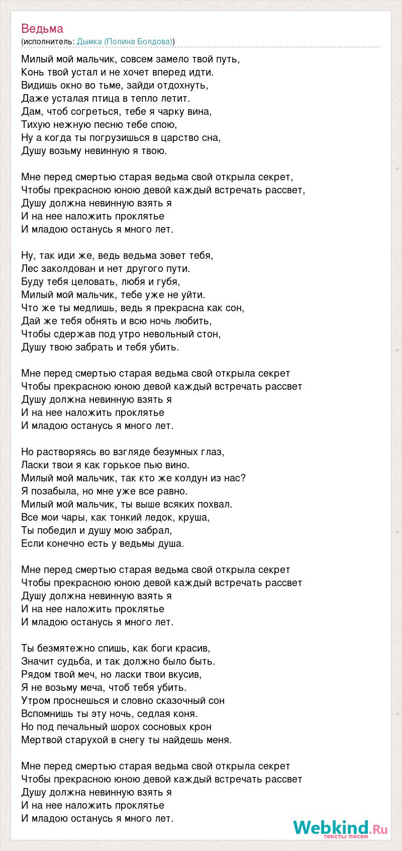 Милый мой мальчик, совсем замело твой путь, Конь твой устал и не хочет вперед идти. Видишь окно во тьме, зайди отдохнуть, Даже усталая птица в тепло летит. Дам, чтоб согреться, тебе я чарку вина, Тихую нежную песню тебе спою, Ну а когда ты погрузишься в царство сна, Душу возьму невинную я твою. Мне перед смертью старая ведьма свой открыла секрет, Чтобы прекрасною юною девой каждый встречать рассвет, Душу должна невинную взять я И на нее наложить проклятье И младою останусь я много лет. Ну, так иди же, ведь ведьма зовет тебя, Лес заколдован и нет другого пути. Буду тебя целовать, любя и губя, Милый мой мальчик, тебе уже не уйти. Что же ты медлишь, ведь я прекрасна как сон, Дай же тебя обнять и всю ночь любить, Чтобы сдержав под утро невольный стон, Душу твою забрать и тебя убить. Мне перед смертью старая ведьма свой открыла секрет Чтобы прекрасною юною девой каждый встречать рассвет Душу должна невинную взять я И на нее наложить проклятье И младою останусь я много лет. Но растворяясь во взгляде безумных глаз, Ласки твои я как горькое пью вино. Милый мой мальчик, так кто же колдун из нас? Я позабыла, но мне уже все равно. Милый мой мальчик, ты выше всяких похвал. Все мои чары, как тонкий ледок, круша, Ты победил и душу мою забрал, Если конечно есть у ведьмы душа. Мне перед смертью старая ведьма свой открыла секрет Чтобы прекрасною юною девой каждый встречать рассвет Душу должна невинную взять я И на нее наложить проклятье И младою останусь я много лет. Ты безмятежно спишь, как боги красив, Значит судьба, и так должно было быть. Рядом твой меч, но ласки твои вкусив, Я не возьму меча, чтоб тебя убить. Утром проснешься и словно сказочный сон Вспомнишь ты эту ночь, седлая коня. Но под печальный шорох сосновых крон Мертвой старухой в снегу ты найдешь меня. Мне перед смертью старая ведьма свой открыла секрет Чтобы прекрасною юною девой каждый встречать рассвет Душу должна невинную взять я И на нее наложить проклятье И младою останусь я много лет.
