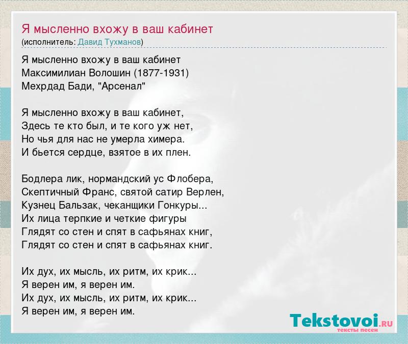 Я мысленно вхожу в ваш кабинет Максимилиан Волошин (1877-1931) Мехрдад Бади, "Арсенал" Я мысленно вхожу в ваш кабинет, Здесь те кто был, и те кого уж нет, Но чья для нас не умерла химера. И бьется сердце, взятое в их плен. Бодлера лик, нормандский ус Флобера, Скептичный Франс, святой сатир Верлен, Кузнец Бальзак, чеканщики Гонкуры... Их лица терпкие и четкие фигуры Глядят со стен и спят в сафьянах книг, Глядят со стен и спят в сафьянах книг. Их дух, их мысль, их ритм, их крик... Я верен им, я верен им. Их дух, их мысль, их ритм, их крик... Я верен им, я верен им.