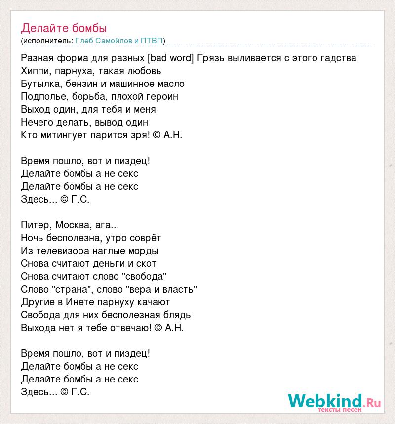 Разная форма для разных [bad word] Грязь выливается с этого гадства Хиппи, парнуха, такая любовь Бутылка, бензин и машинное масло Подполье, борьба, плохой героин Выход один, для тебя и меня Нечего делать, вывод один Кто митингует парится зря! © А.Н. Время пошло, вот и пиздец! Делайте бомбы а не секс Делайте бомбы а не секс Здесь... © Г.С. Питер, Москва, ага... Ночь бесполезна, утро соврёт Из телевизора наглые морды Снова считают деньги и скот Снова считают слово "свобода" Слово "страна", слово "вера и власть" Другие в Инете парнуху качают Свобода для них бесполезная блядь Выхода нет я тебе отвечаю! © А.Н. Время пошло, вот и пиздец! Делайте бомбы а не секс Делайте бомбы а не секс Здесь... © Г.С.