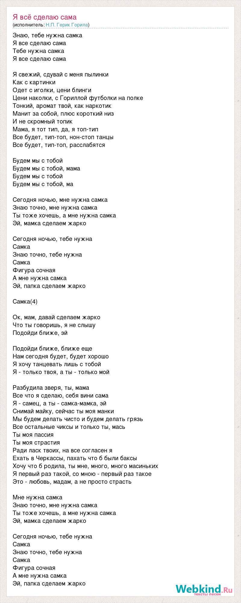 Знаю, тебе нужна самка Я все сделаю сама Тебе нужна самка Я все сделаю сама Я свежий, сдувай с меня пылинки Как с картинки Одет с иголки, цени блинги Цени наколки, с Гориллой футболки на полке Тонкий, аромат твой, как наркотик Манит за собой, плюс короткий низ И не скромный топик Мама, я тот тип, да, я топ-тип Все будет, тип-топ, нон-стоп танцы Все будет, тип-топ, расслабятся Будем мы с тобой Будем мы с тобой, мама Будем мы с тобой Будем мы с тобой, ма Сегодня ночью, мне нужна самка Знаю точно, мне нужна самка Ты тоже хочешь, а мне нужна самка Эй, мамка сделаем жарко Сегодня ночью, тебе нужна Самка Знаю точно, тебе нужна Самка Фигура сочная А мне нужна самка Эй, папка сделаем жарко Самка(4) Ок, мам, давай сделаем жарко Что ты говоришь, я не слышу Подойди ближе, эй Подойди ближе, ближе еще Нам сегодня будет, будет хорошо Я хочу танцевать лишь с тобой Я - только твоя, а ты - только мой Разбудила зверя, ты, мама Все что я сделаю, себя вини сама Я - самец, а ты - самка-мамка, эй Снимай майку, сейчас ты моя манки Мы будем делать чисто и будем делать грязь Все остальные чиксы и только ты, мась Ты моя пассия Ты моя страстия Ради ласк твоих, на все согласен я Ехать в Черкассы, пахать что б были баксы Хочу что б родила, ты мне, много, много масиньких Я первый раз такой, со мною - первый раз такое Это - любовь, мадам, а не просто страсть Мне нужна самка Знаю точно, мне нужна самка Ты тоже хочешь, а мне нужна самка Эй, мамка сделаем жарко Сегодня ночью, тебе нужна Самка Знаю точно, тебе нужна Самка Фигура сочная А мне нужна самка Эй, папка сделаем жарко