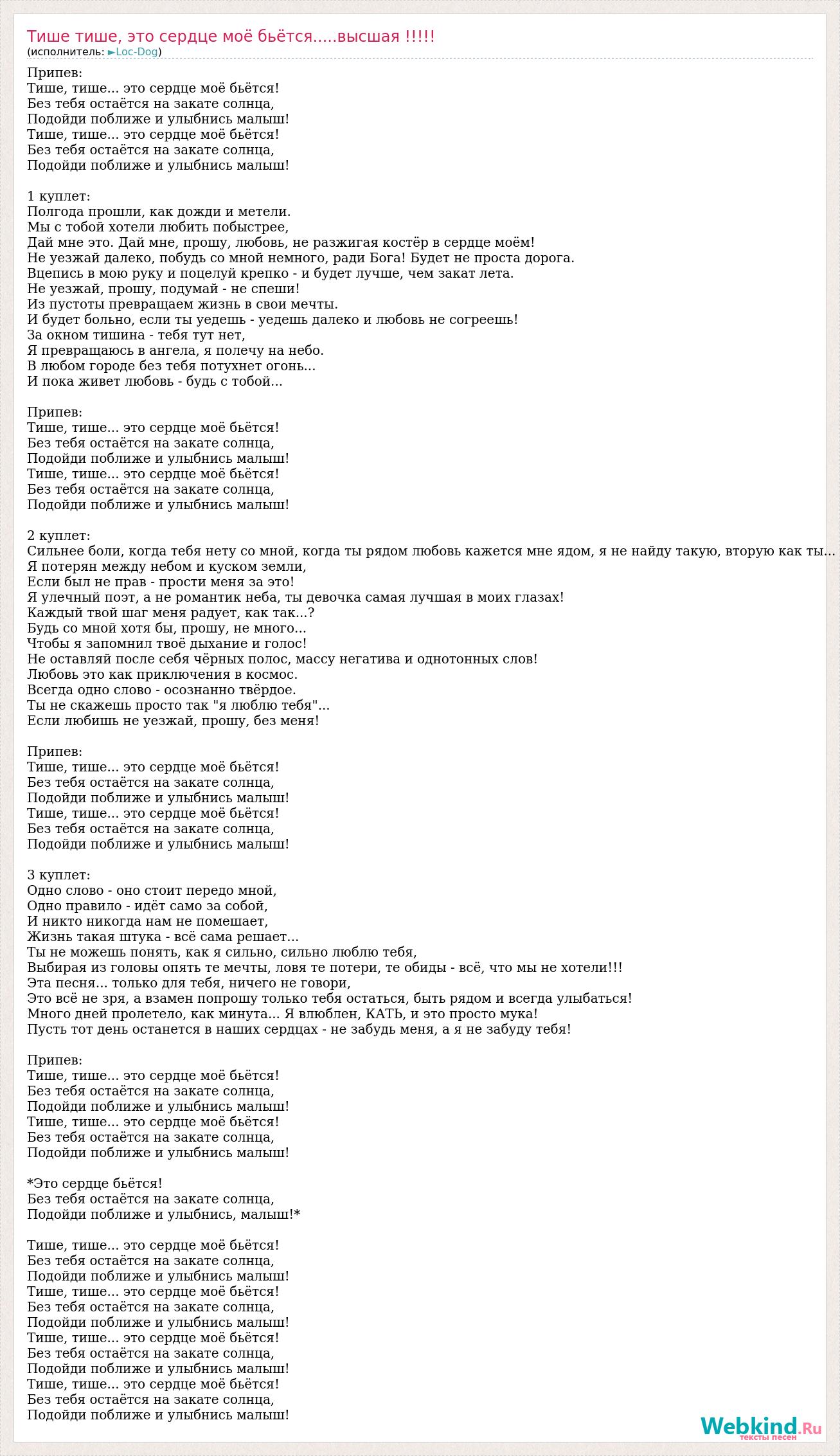 Припев: Тише, тише... это сердце моё бьётся! Без тебя остаётся на закате солнца, Подойди поближе и улыбнись малыш! Тише, тише... это сердце моё бьётся! Без тебя остаётся на закате солнца, Подойди поближе и улыбнись малыш! 1 куплет: Полгода прошли, как дожди и метели. Мы с тобой хотели любить побыстрее, Дай мне это. Дай мне, прошу, любовь, не разжигая костёр в сердце моём! Не уезжай далеко, побудь со мной немного, ради Бога! Будет не проста дорога. Вцепись в мою руку и поцелуй крепко - и будет лучше, чем закат лета. Не уезжай, прошу, подумай - не спеши! Из пустоты превращаем жизнь в свои мечты. И будет больно, если ты уедешь - уедешь далеко и любовь не согреешь! За окном тишина - тебя тут нет, Я превращаюсь в ангела, я полечу на небо. В любом городе без тебя потухнет огонь... И пока живет любовь - будь с тобой... Припев: Тише, тише... это сердце моё бьётся! Без тебя остаётся на закате солнца, Подойди поближе и улыбнись малыш! Тише, тише... это сердце моё бьётся! Без тебя остаётся на закате солнца, Подойди поближе и улыбнись малыш! 2 куплет: Сильнее боли, когда тебя нету со мной, когда ты рядом любовь кажется мне ядом, я не найду такую, вторую как ты... Я потерян между небом и куском земли, Если был не прав - прости меня за это! Я улечный поэт, а не романтик неба, ты девочка самая лучшая в моих глазах! Каждый твой шаг меня радует, как так...? Будь со мной хотя бы, прошу, не много... Чтобы я запомнил твоё дыхание и голос! Не оставляй после себя чёрных полос, массу негатива и однотонных слов! Любовь это как приключения в космос. Всегда одно слово - осознанно твёрдое. Ты не скажешь просто так "я люблю тебя"... Если любишь не уезжай, прошу, без меня! Припев: Тише, тише... это сердце моё бьётся! Без тебя остаётся на закате солнца, Подойди поближе и улыбнись малыш! Тише, тише... это сердце моё бьётся! Без тебя остаётся на закате солнца, Подойди поближе и улыбнись малыш! 3 куплет: Одно слово - оно стоит передо мной, Одно правило - идёт само за собой, И никто никогда нам не помешает, Жизнь такая штука - всё сама решает... Ты не можешь понять, как я сильно, сильно люблю тебя, Выбирая из головы опять те мечты, ловя те потери, те обиды - всё, что мы не хотели!!! Эта песня... только для тебя, ничего не говори, Это всё не зря, а взамен попрошу только тебя остаться, быть рядом и всегда улыбаться! Много дней пролетело, как минута... Я влюблен, КАТЬ, и это просто мука! Пусть тот день останется в наших сердцах - не забудь меня, а я не забуду тебя! Припев: Тише, тише... это сердце моё бьётся! Без тебя остаётся на закате солнца, Подойди поближе и улыбнись малыш! Тише, тише... это сердце моё бьётся! Без тебя остаётся на закате солнца, Подойди поближе и улыбнись малыш! *Это сердце бьётся! Без тебя остаётся на закате солнца, Подойди поближе и улыбнись, малыш!* Тише, тише... это сердце моё бьётся! Без тебя остаётся на закате солнца, Подойди поближе и улыбнись малыш! Тише, тише... это сердце моё бьётся! Без тебя остаётся на закате солнца, Подойди поближе и улыбнись малыш! Тише, тише... это сердце моё бьётся! Без тебя остаётся на закате солнца, Подойди поближе и улыбнись малыш! Тише, тише... это сердце моё бьётся! Без тебя остаётся на закате солнца, Подойди поближе и улыбнись малыш!