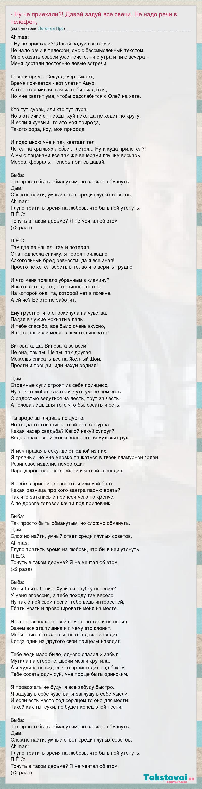 Главная→Исполнители→Легенды Про→- Ну че приехали?! Давай задуй все свечи. Не надо речи в телефон, смс с