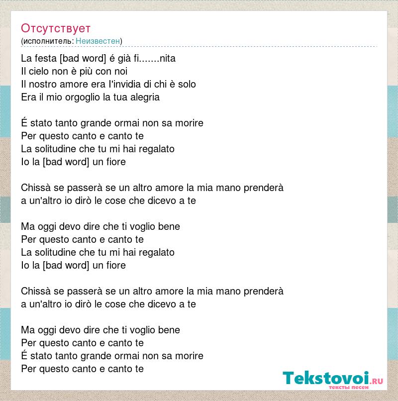 La festa appena cominciata é già fi.......nita Il cielo non è più con noi Il nostro amore era I'invidia di chi è solo Era il mio orgoglio la tua alegria É stato tanto grande ormai non sa morire Per questo canto e canto te La solitudine che tu mi hai regalato Io la coltivo come un fiore Chissà se passerà se un altro amore la mia mano prenderà a un'altro io dirò le cose che dicevo a te Ma oggi devo dire che ti voglio bene Per questo canto e canto te La solitudine che tu mi hai regalato Io la colitivo come un fiore Chissà se passerà se un altro amore la mia mano prenderà a un'altro io dirò le cose che dicevo a te Ma oggi devo dire che ti voglio bene Per questo canto e canto te É stato tanto grande ormai non sa morire Per questo canto e canto te