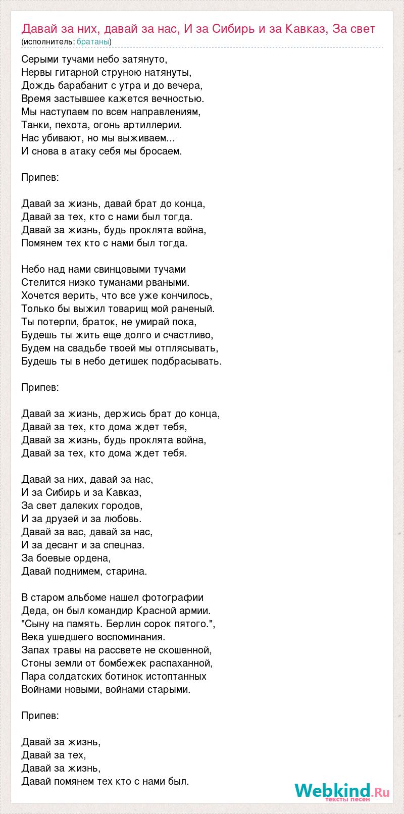 Серыми тучами небо затянуто, Нервы гитарной струною натянуты, Дождь барабанит с утра и до вечера, Время застывшее кажется вечностью. Мы наступаем по всем направлениям, Танки, пехота, огонь артиллерии. Нас убивают, но мы выживаем... И снова в атаку себя мы бросаем. Припев: Давай за жизнь, давай брат до конца, Давай за тех, кто с нами был тогда. Давай за жизнь, будь проклята война, Помянем тех кто с нами был тогда. Небо над нами свинцовыми тучами Стелится низко туманами рваными. Хочется верить, что все уже кончилось, Только бы выжил товарищ мой раненый. Ты потерпи, браток, не умирай пока, Будешь ты жить еще долго и счастливо, Будем на свадьбе твоей мы отплясывать, Будешь ты в небо детишек подбрасывать. Припев: Давай за жизнь, держись брат до конца, Давай за тех, кто дома ждет тебя, Давай за жизнь, будь проклята война, Давай за тех, кто дома ждет тебя. Давай за них, давай за нас, И за Сибирь и за Кавказ, За свет далеких городов, И за друзей и за любовь. Давай за вас, давай за нас, И за десант и за спецназ. За боевые ордена, Давай поднимем, старина. В старом альбоме нашел фотографии Деда, он был командир Красной армии. "Сыну на память. Берлин сорок пятого.", Века ушедшего воспоминания. Запах травы на рассвете не скошенной, Стоны земли от бомбежек распаханной, Пара солдатских ботинок истоптанных Войнами новыми, войнами старыми. Припев: Давай за жизнь, Давай за тех, Давай за жизнь, Давай помянем тех кто с нами был.