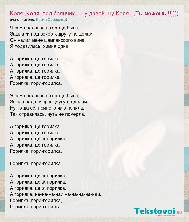 А как ты думаешь, о чем песня "Коля ,Коля, под баянчик....ну давай, ну Коля...,Ты можешь!!!))))" ?