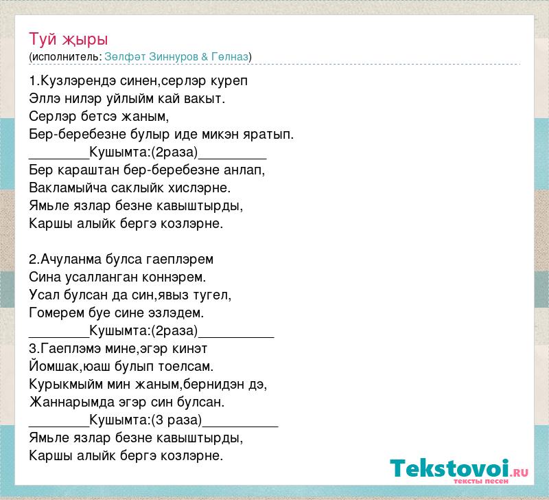1.Кузлэрендэ синен,серлэр куреп Эллэ нилэр уйлыйм кай вакыт. Серлэр бетсэ жаным, Бер-беребезне булыр иде микэн яратып. ________Кушымта:(2раза)_________ Бер караштан бер-беребезне анлап, Вакламыйча саклыйк хислэрне. Ямьле язлар безне кавыштырды, Каршы алыйк бергэ козлэрне. 2.Ачуланма булса гаеплэрем Сина усалланган коннэрем. Усал булсан да син,явыз тугел, Гомерем буе сине эзлэдем. ________Кушымта:(2раза)__________ 3.Гаеплэмэ мине,эгэр кинэт Йомшак,юаш булып тоелсам. Курыкмыйм мин жаным,бернидэн дэ, Жаннарымда эгэр син булсан. ________Кушымта:(3 раза)__________ Ямьле язлар безне кавыштырды, Каршы алыйк бергэ козлэрне.