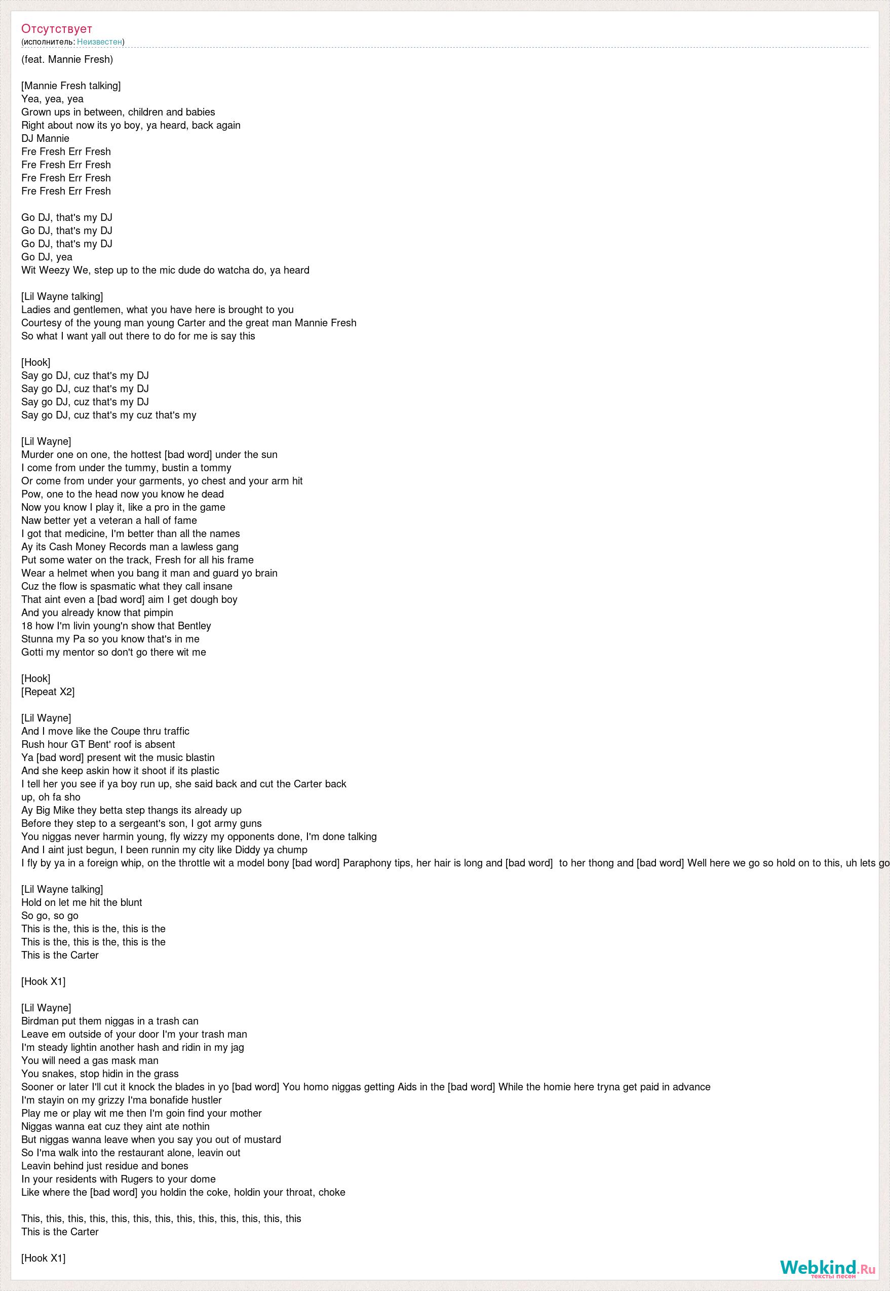 (feat. Mannie Fresh) [Mannie Fresh talking] Yea, yea, yea Grown ups in between, children and babies Right about now its yo boy, ya heard, back again DJ Mannie Fre Fresh Err Fresh Fre Fresh Err Fresh Fre Fresh Err Fresh Fre Fresh Err Fresh Go DJ, that's my DJ Go DJ, that's my DJ Go DJ, that's my DJ Go DJ, yea Wit Weezy We, step up to the mic dude do watcha do, ya heard [Lil Wayne talking] Ladies and gentlemen, what you have here is brought to you Courtesy of the young man young Carter and the great man Mannie Fresh So what I want yall out there to do for me is say this [Hook] Say go DJ, cuz that's my DJ Say go DJ, cuz that's my DJ Say go DJ, cuz that's my DJ Say go DJ, cuz that's my cuz that's my [Lil Wayne] Murder one on one, the hottest [bad word] under the sun I come from under the tummy, bustin a tommy Or come from under your garments, yo chest and your arm hit Pow, one to the head now you know he dead Now you know I play it, like a pro in the game Naw better yet a veteran a hall of fame I got that medicine, I'm better than all the names Ay its Cash Money Records man a lawless gang Put some water on the track, Fresh for all his frame Wear a helmet when you bang it man and guard yo brain Cuz the flow is spasmatic what they call insane That aint even a [bad word] aim I get dough boy And you already know that pimpin 18 how I'm livin young'n show that Bentley Stunna my Pa so you know that's in me Gotti my mentor so don't go there wit me [Hook] [Repeat X2] [Lil Wayne] And I move like the Coupe thru traffic Rush hour GT Bent' roof is absent Ya [bad word] present wit the music blastin And she keep askin how it shoot if its plastic I tell her you see if ya boy run up, she said back and cut the Carter back up, oh fa sho Ay Big Mike they betta step thangs its already up Before they step to a sergeant's son, I got army guns You niggas never harmin young, fly wizzy my opponents done, I'm done talking And I aint just begun, I been runnin my city like Diddy ya chump I fly by ya in a foreign whip, on the throttle wit a model bony [bad word] Paraphony tips, her hair is long and [bad word] to her thong and [bad word] Well here we go so hold on to this, uh lets go [Lil Wayne talking] Hold on let me hit the blunt So go, so go This is the, this is the, this is the This is the, this is the, this is the This is the Carter [Hook X1] [Lil Wayne] Birdman put them niggas in a trash can Leave em outside of your door I'm your trash man I'm steady lightin another hash and ridin in my jag You will need a gas mask man You snakes, stop hidin in the grass Sooner or later I'll cut it knock the blades in yo [bad word] You homo niggas getting Aids in the [bad word] While the homie here tryna get paid in advance I'm stayin on my grizzy I'ma bonafide hustler Play me or play wit me then I'm goin find your mother Niggas wanna eat cuz they aint ate nothin But niggas wanna leave when you say you out of mustard So I'ma walk into the restaurant alone, leavin out Leavin behind just residue and bones In your residents with Rugers to your dome Like where the [bad word] you holdin the coke, holdin your throat, choke This, this, this, this, this, this, this, this, this, this, this, this, this This is the Carter [Hook X1]