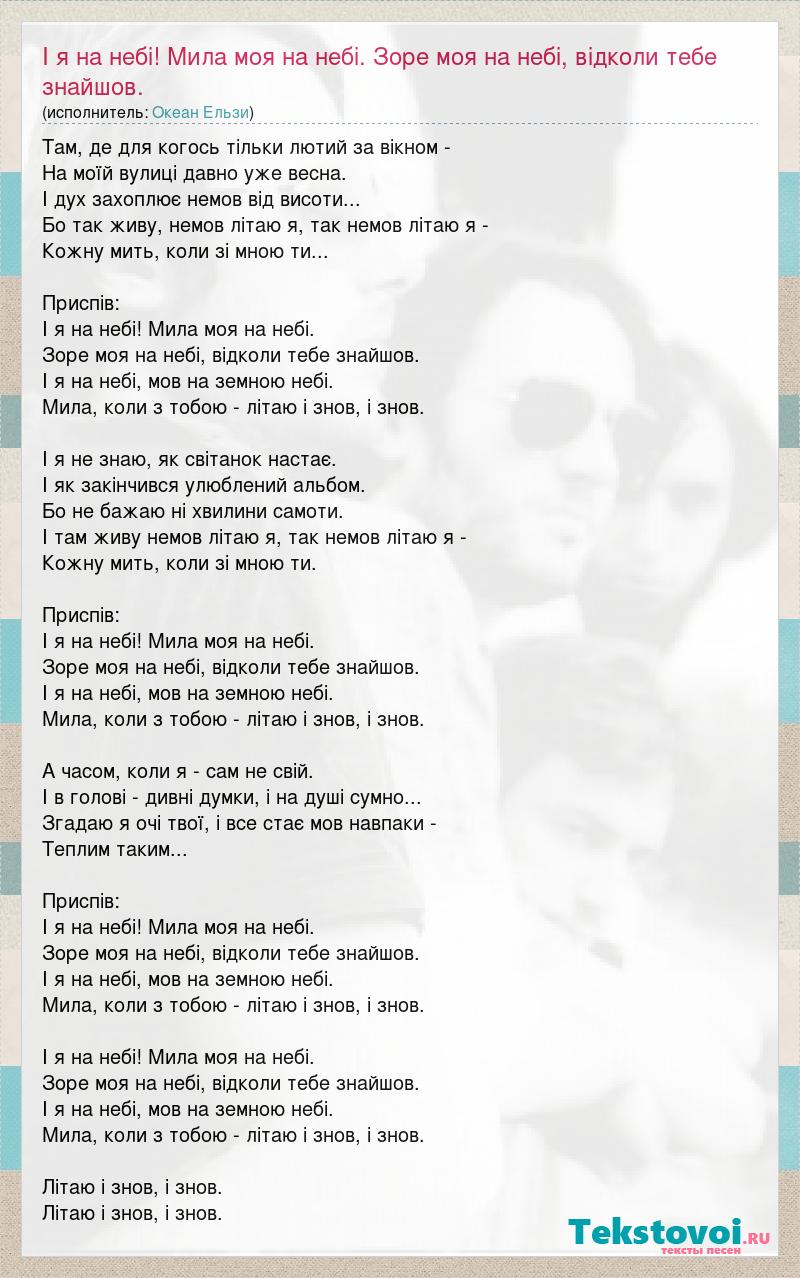 Главная→Исполнители→Океан Ельзи→І я на небі! Мила моя на небі. Зоре моя на небі, відколи тебе знайшов.