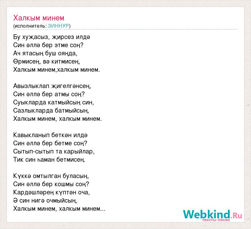 Бу хуҗасыз, җирсез илдә Син әллә бер этме соң? Ач ятасың буш ояңда, Өрмисең, вә китмисең, Халкым минем,халкым минем. Авызлыклап җигелгәнсең, Син әллә бер атмы соң? Суыкларда катмыйсың син, Сазлыкларда батмыйсың, Халкым минем, халкым минем. Кавыкланып беткән илдә Син әллә бер бетме соң? Сытып-сытып та карыйлар, Тик син һаман бетмисең. Күккә омтылган буласың, Син әллә бер кошмы соң? Кардәшләрең күптән оча, Ә син нигә очмыйсың, Халкым минем, халкым минем...