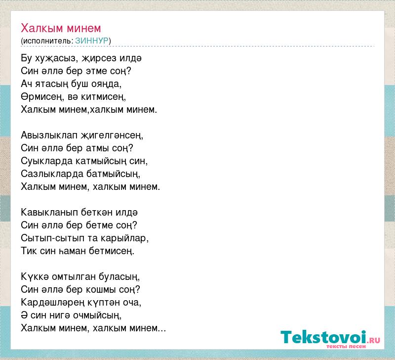 Бу хуҗасыз, җирсез илдә Син әллә бер этме соң? Ач ятасың буш ояңда, Өрмисең, вә китмисең, Халкым минем,халкым минем. Авызлыклап җигелгәнсең, Син әллә бер атмы соң? Суыкларда катмыйсың син, Сазлыкларда батмыйсың, Халкым минем, халкым минем. Кавыкланып беткән илдә Син әллә бер бетме соң? Сытып-сытып та карыйлар, Тик син һаман бетмисең. Күккә омтылган буласың, Син әллә бер кошмы соң? Кардәшләрең күптән оча, Ә син нигә очмыйсың, Халкым минем, халкым минем...