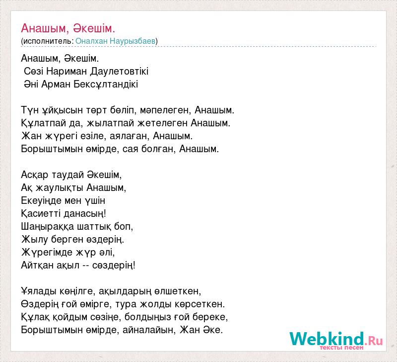 Анашым, Әкешім. Сөзі Нариман Даулетовтікі Әні Арман Бексұлтандікі Түн ұйқысын төрт бөліп, мәпелеген, Анашым. Құлатпай да, жылатпай жетелеген Анашым. Жан жүрегі езіле, аялаған, Анашым. Борыштымын өмірде, сая болған, Анашым. Асқар таудай Әкешім, Ақ жаулықты Анашым, Екеуіңде мен үшін Қасиетті данасың! Шаңыраққа шаттық боп, Жылу берген өздерің. Жүрегімде жүр әлі, Айтқан ақыл -- сөздерің! Ұялады көңілге, ақылдарың өлшеткен, Өздерің ғой өмірге, тура жолды көрсеткен. Құлақ қойдым сөзіңе, болдыңыз ғой береке, Борыштымын өмірде, айналайын, Жан Әке.