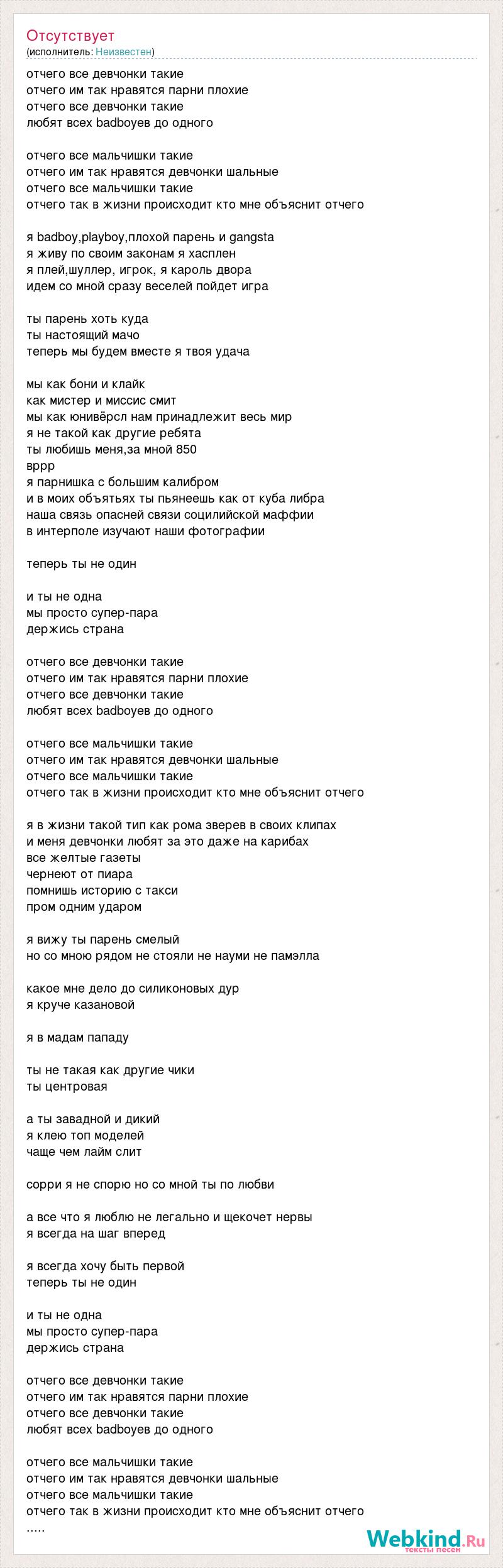 отчего все девчонки такие отчего им так нравятся парни плохие отчего все девчонки такие любят всех badboyев до одного отчего все мальчишки такие отчего им так нравятся девчонки шальные отчего все мальчишки такие отчего так в жизни происходит кто мне объяснит отчего я badboy,playboy,плохой парень и gangsta я живу по своим законам я хасплен я плей,шуллер, игрок, я кароль двора идем со мной сразу веселей пойдет игра ты парень хоть куда ты настоящий мачо теперь мы будем вместе я твоя удача мы как бони и клайк как мистер и миссис смит мы как юнивёрсл нам принадлежит весь мир я не такой как другие ребята ты любишь меня,за мной 850 вррр я парнишка с большим калибром и в моих объятьях ты пьянеешь как от куба либра наша связь опасней связи социлийской маффии в интерполе изучают наши фотографии теперь ты не один и ты не одна мы просто супер-пара держись страна отчего все девчонки такие отчего им так нравятся парни плохие отчего все девчонки такие любят всех badboyев до одного отчего все мальчишки такие отчего им так нравятся девчонки шальные отчего все мальчишки такие отчего так в жизни происходит кто мне объяснит отчего я в жизни такой тип как рома зверев в своих клипах и меня девчонки любят за это даже на карибах все желтые газеты чернеют от пиара помнишь историю с такси пром одним ударом я вижу ты парень смелый но со мною рядом не стояли не науми не памэлла какое мне дело до силиконовых дур я круче казановой я в мадам пападу ты не такая как другие чики ты центровая а ты завадной и дикий я клею топ моделей чаще чем лайм слит сорри я не спорю но со мной ты по любви а все что я люблю не легально и щекочет нервы я всегда на шаг вперед я всегда хочу быть первой теперь ты не один и ты не одна мы просто супер-пара держись страна отчего все девчонки такие отчего им так нравятся парни плохие отчего все девчонки такие любят всех badboyев до одного отчего все мальчишки такие отчего им так нравятся девчонки шальные отчего все мальчишки такие отчего так в жизни происходит кто мне объяснит отчего .....