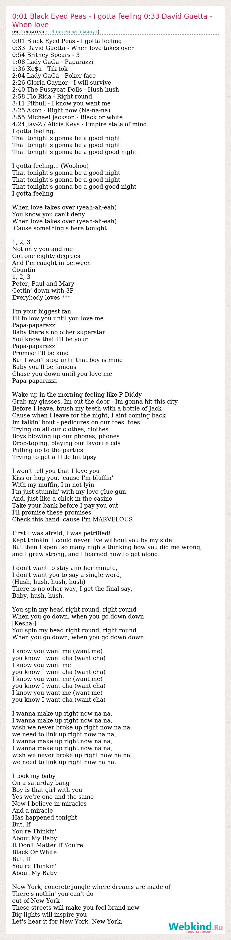 0:01 Black Eyed Peas - I gotta feeling 0:33 David Guetta - When love takes over 0:54 Britney Spears - 3 1:08 Lady GaGa - Paparazzi 1:36 Ke$a - Tik tok 2:04 Lady GaGa - Poker face 2:26 Gloria Gaynor - I will survive 2:40 The Pussycat Dolls - Hush hush 2:58 Flo Rida - Right round 3:11 Pitbull - I know you want me 3:25 Akon - Right now (Na-na-na) 3:55 Michael Jackson - Black or white 4:24 Jay-Z / Alicia Keys - Empire state of mind I gotta feeling... That tonight's gonna be a good night That tonight's gonna be a good night That tonight's gonna be a good good night I gotta feeling... (Woohoo) That tonight's gonna be a good night That tonight's gonna be a good night That tonight's gonna be a good good night I gotta feeling When love takes over (yeah-ah-eah) You know you can't deny When love takes over (yeah-ah-eah) 'Cause something's here tonight 1, 2, 3 Not only you and me Got one eighty degrees And I'm caught in between Countin' 1, 2, 3 Peter, Paul and Mary Gettin' down with 3P Everybody loves *** I'm your biggest fan I'll follow you until you love me Papa-paparazzi Baby there's no other superstar You know that I'll be your Papa-paparazzi Promise I'll be kind But I won't stop until that boy is mine Baby you'll be famous Chase you down until you love me Papa-paparazzi Wake up in the morning feeling like P Diddy Grab my glasses, Im out the door - Im gonna hit this city Before I leave, brush my teeth with a bottle of Jack Cause when I leave for the night, I aint coming back Im talkin' bout - pedicures on our toes, toes Trying on all our clothes, clothes Boys blowing up our phones, phones Drop-toping, playing our favorite cds Pulling up to the parties Trying to get a little bit tipsy I won't tell you that I love you Kiss or hug you, 'cause I'm bluffin' With my muffin, I'm not lyin' I'm just stunnin' with my love glue gun And, just like a chick in the casino Take your bank before I pay you out I'll promise these promises Check this hand 'cause I'm MARVELOUS First I was afraid, I was petrified! Kept thinkin' I could never live without you by my side But then I spent so many nights thinking how you did me wrong, and I grew strong, and I learned how to get along. I don't want to stay another minute, I don't want you to say a single word, (Hush, hush, hush, hush) There is no other way, I get the final say, Baby, hush, hush. You spin my head right round, right round When you go down, when you go down down [Kesha:] You spin my head right round, right round When you go down, when you go down down I know you want me (want me) you know I want cha (want cha) I know you want me you know I want cha (want cha) I know you want me (want me) you know I want cha (want cha) I know you want me (want me) you know I want cha (want cha) I wanna make up right now na na, I wanna make up right now na na, wish we never broke up right now na na, we need to link up right now na na, I wanna make up right now na na, I wanna make up right now na na, wish we never broke up right now na na, we need to link up right now na na. I took my baby On a saturday bang Boy is that girl with you Yes we're one and the same Now I believe in miracles And a miracle Has happened tonight But, If You're Thinkin' About My Baby It Don't Matter If You're Black Or White But, If You're Thinkin' About My Baby New York, concrete jungle where dreams are made of There's nothin' you can't do out of New York These streets will make you feel brand new Big lights will inspire you Let's hear it for New York, New York,