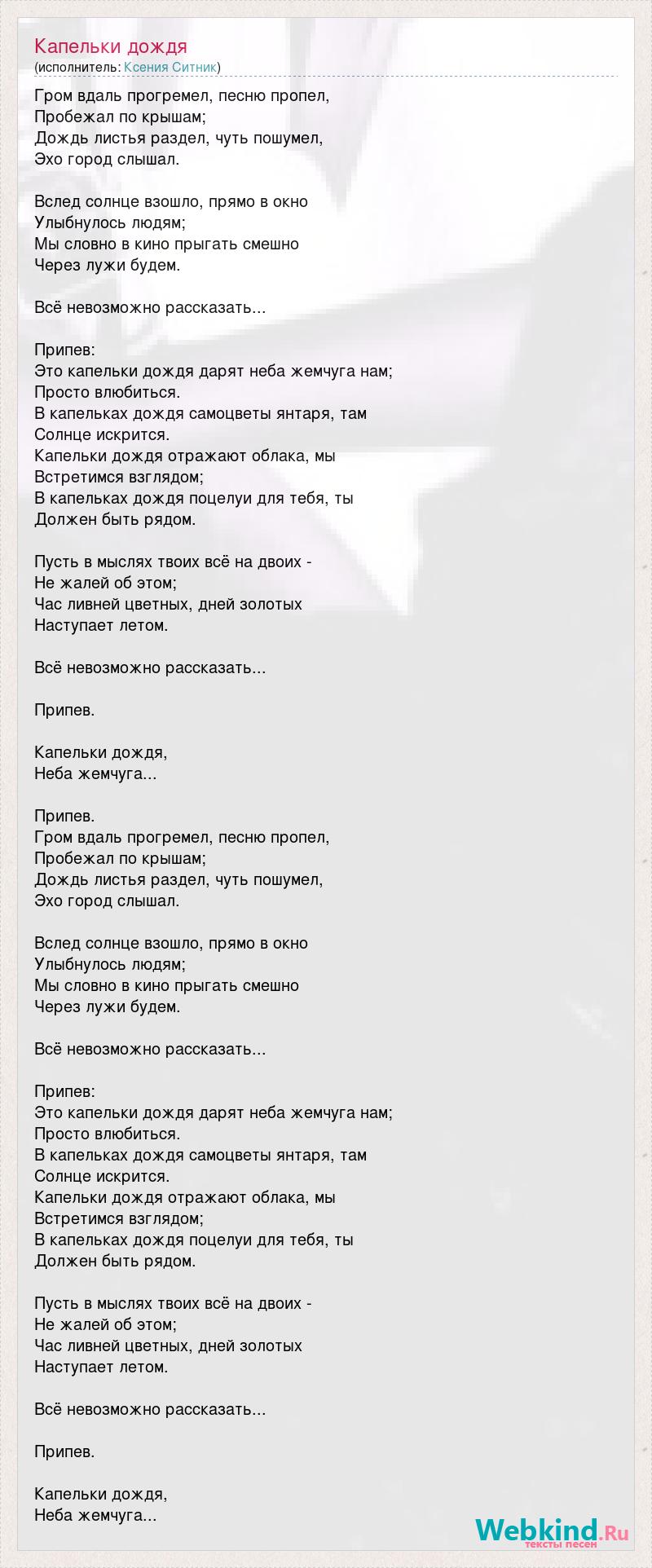 Гром вдаль прогремел, песню пропел, Пробежал по крышам; Дождь листья раздел, чуть пошумел, Эхо город слышал. Вслед солнце взошло, прямо в окно Улыбнулось людям; Мы словно в кино прыгать смешно Через лужи будем. Всё невозможно рассказать... Припев: Это капельки дождя дарят неба жемчуга нам; Просто влюбиться. В капельках дождя самоцветы янтаря, там Солнце искрится. Капельки дождя отражают облака, мы Встретимся взглядом; В капельках дождя поцелуи для тебя, ты Должен быть рядом. Пусть в мыслях твоих всё на двоих - Не жалей об этом; Час ливней цветных, дней золотых Наступает летом. Всё невозможно рассказать... Припев. Капельки дождя, Неба жемчуга... Припев. Гром вдаль прогремел, песню пропел, Пробежал по крышам; Дождь листья раздел, чуть пошумел, Эхо город слышал. Вслед солнце взошло, прямо в окно Улыбнулось людям; Мы словно в кино прыгать смешно Через лужи будем. Всё невозможно рассказать... Припев: Это капельки дождя дарят неба жемчуга нам; Просто влюбиться. В капельках дождя самоцветы янтаря, там Солнце искрится. Капельки дождя отражают облака, мы Встретимся взглядом; В капельках дождя поцелуи для тебя, ты Должен быть рядом. Пусть в мыслях твоих всё на двоих - Не жалей об этом; Час ливней цветных, дней золотых Наступает летом. Всё невозможно рассказать... Припев. Капельки дождя, Неба жемчуга...
