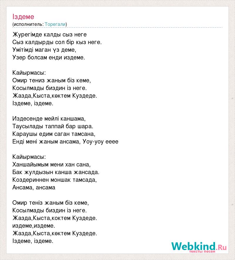 Журегімде калды сыз неге Сыз калдырды сол бір кыз неге. Умітімді маган үз деме, Узер болсам енди издеме. Кайырмасы: Омир тениз жаным біз кеме, Косылмады биздин із неге. Жазда,Кыста,көктем Куздеде. Іздеме, іздеме. Издесенде мейлі каншама, Таусылады таппай бар шара. Караушы едим саган тамсана, Енді мені жаным ансама, Уоу-уоу ееее Кайырмасы: Ханшайымым мени хан сана, Бак жулдызын канша жансада. Коздериннен моншак тамсада, Ансама, ансама Омир теніз жаным біз кеме, Косылмады биздин із неге. Жазда,Кыста,коктем Куздеде. издеме,издеме. Жазда,Кыста,көктем Куздеде. Іздеме, іздеме.