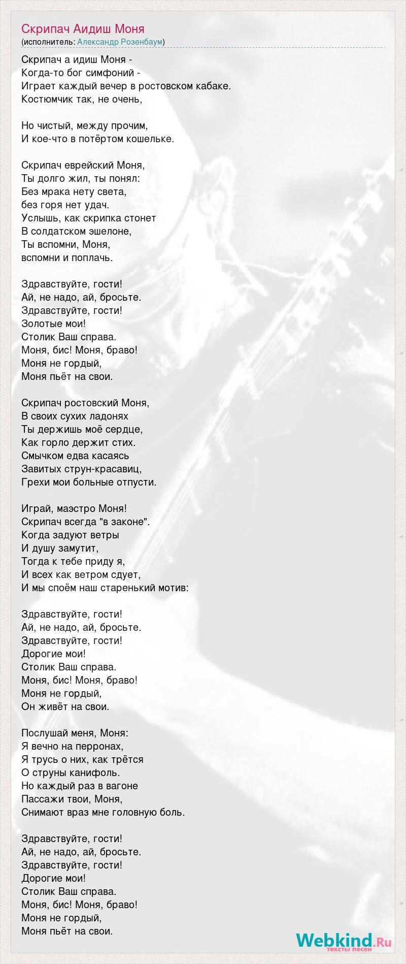 Скрипач а идиш Моня - Когда-то бог симфоний - Играет каждый вечер в ростовском кабаке. Костюмчик так, не очень, Но чистый, между прочим, И кое-что в потёртом кошельке. Скрипач еврейский Моня, Ты долго жил, ты понял: Без мрака нету света, без горя нет удач. Услышь, как скрипка стонет В солдатском эшелоне, Ты вспомни, Моня, вспомни и поплачь. Здравствуйте, гости! Ай, не надо, ай, бросьте. Здравствуйте, гости! Золотые мои! Столик Ваш справа. Моня, бис! Моня, браво! Моня не гордый, Моня пьёт на свои. Скрипач ростовский Моня, В своих сухих ладонях Ты держишь моё сердце, Как горло держит стих. Смычком едва касаясь Завитых струн-красавиц, Грехи мои больные отпусти. Играй, маэстро Моня! Скрипач всегда "в законе". Когда задуют ветры И душу замутит, Тогда к тебе приду я, И всех как ветром сдует, И мы споём наш старенький мотив: Здравствуйте, гости! Ай, не надо, ай, бросьте. Здравствуйте, гости! Дорогие мои! Столик Ваш справа. Моня, бис! Моня, браво! Моня не гордый, Он живёт на свои. Послушай меня, Моня: Я вечно на перронах, Я трусь о них, как трётся О струны канифоль. Но каждый раз в вагоне Пассажи твои, Моня, Снимают враз мне головную боль. Здравствуйте, гости! Ай, не надо, ай, бросьте. Здравствуйте, гости! Дорогие мои! Столик Ваш справа. Моня, бис! Моня, браво! Моня не гордый, Моня пьёт на свои.